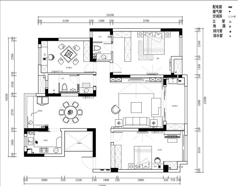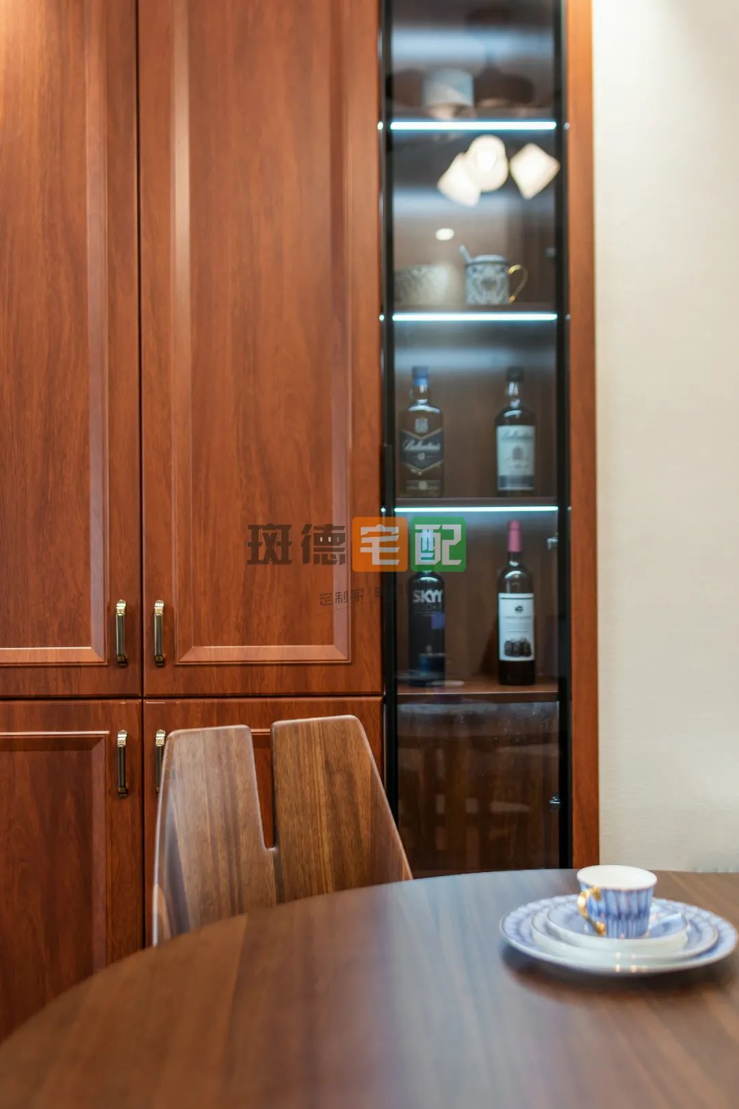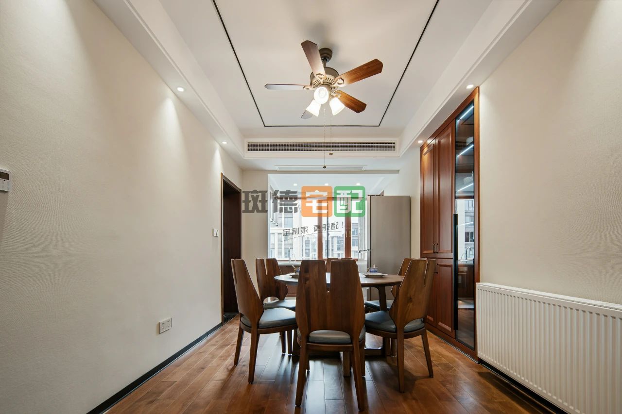 4. 餐廳凈空2.7米,進(jìn)深空間不是很寬敞。業(yè)主想做餐邊柜又想放圓桌。設(shè)計(jì)師巧妙拆除東面公衛(wèi)墻體中間的磚墻,嵌入一組定制餐邊柜,一舉兩得。