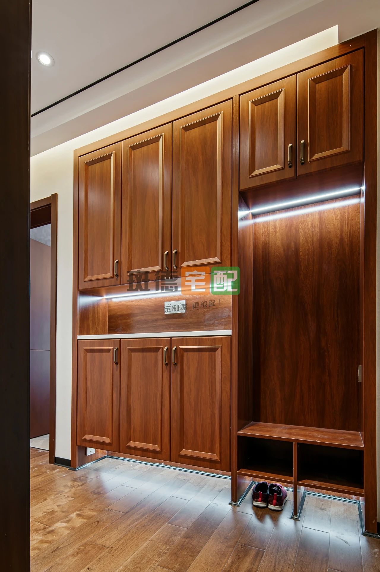 玄關(guān)吊頂采用反燈槽設(shè)計(jì),兩邊燈光全部鋪滿兩面墻體,既美觀又溫馨放松。