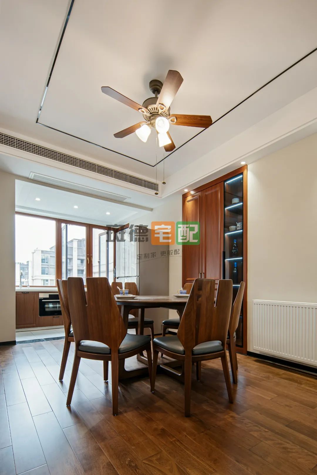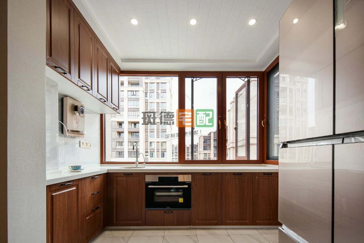 3. 廚房空間非常緊湊,拆改北陽(yáng)臺(tái)做成西廚區(qū)并入餐廳,容納烤箱、飲水機(jī)、冰箱等電器,使整個(gè)居室空間既通透又實(shí)用。