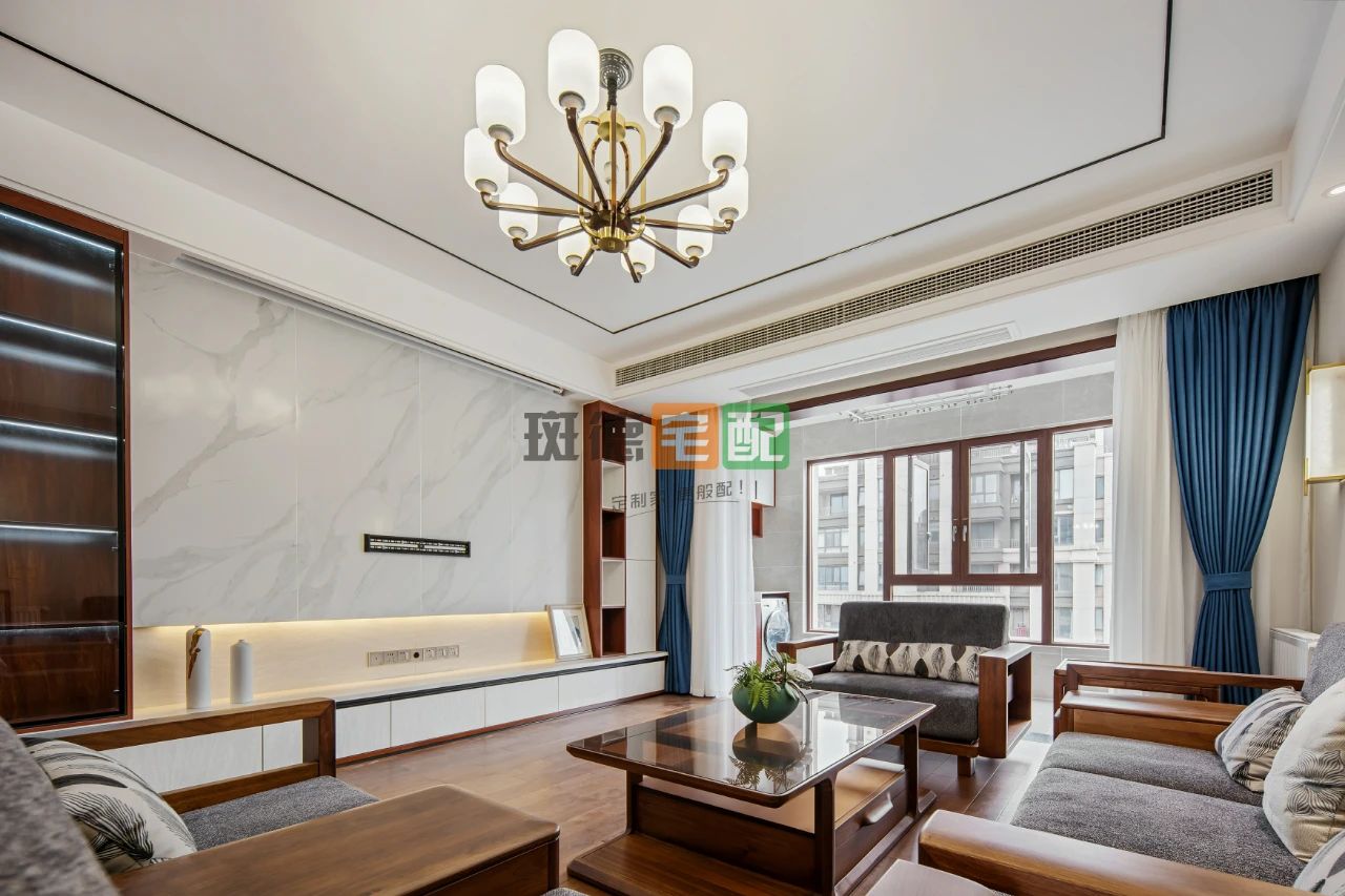 5. 客廳電視背景墻采用組合柜設(shè)計(jì),兩邊做裝飾收納柜,中間背景墻用巖板磚做造型,電視矮柜用大理石鋪設(shè)臺(tái)面,收納強(qiáng)大又美觀大氣。