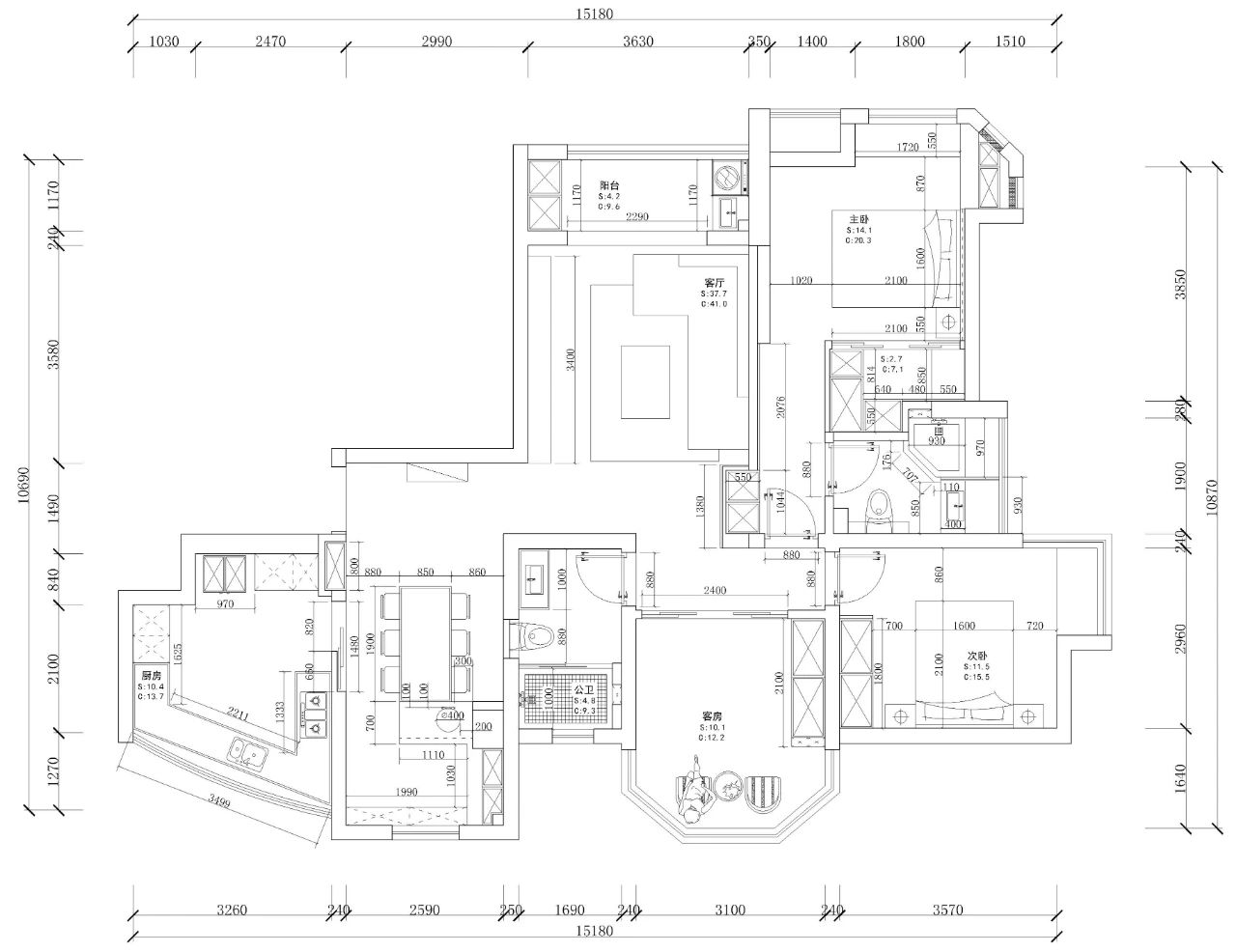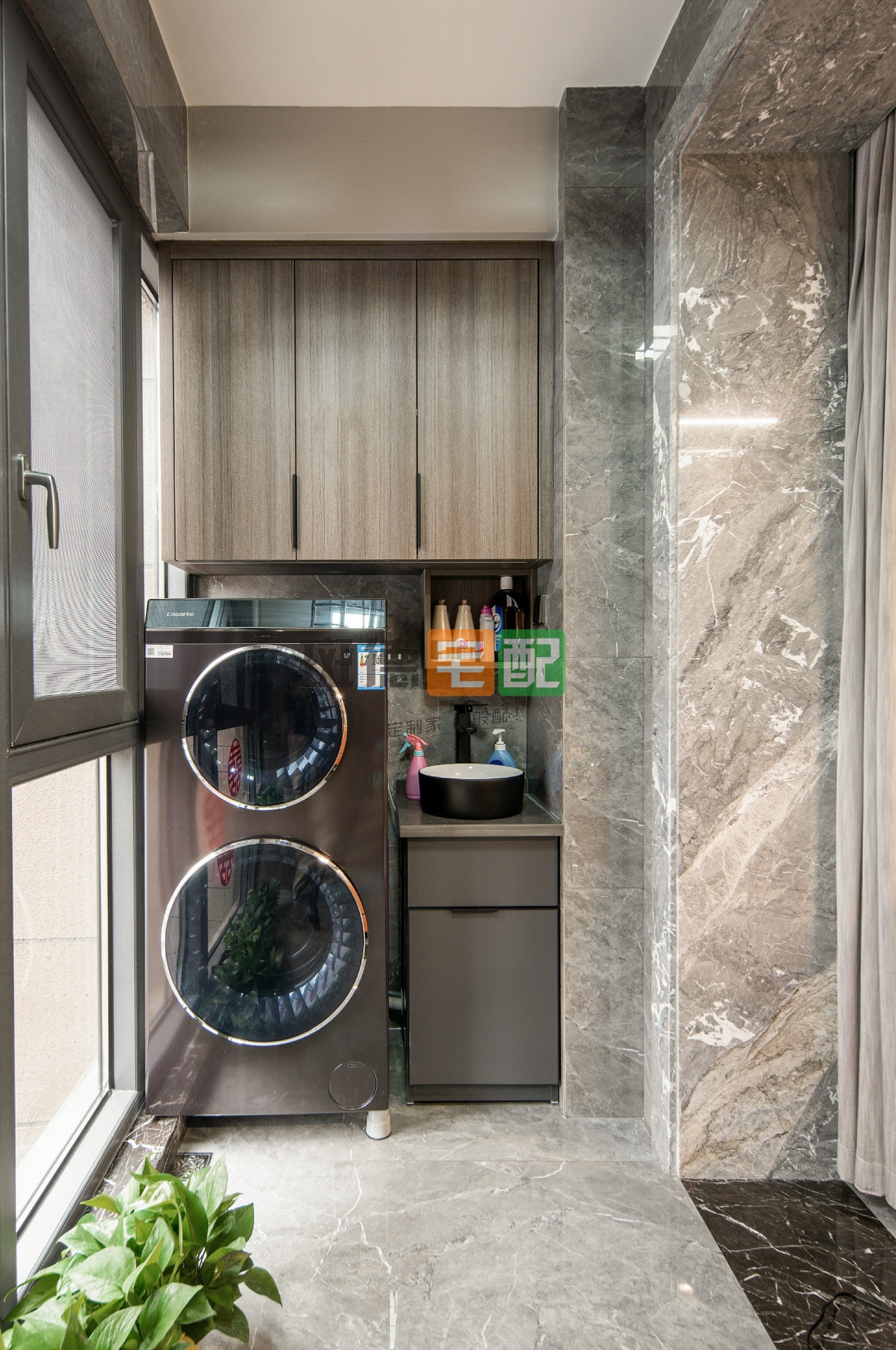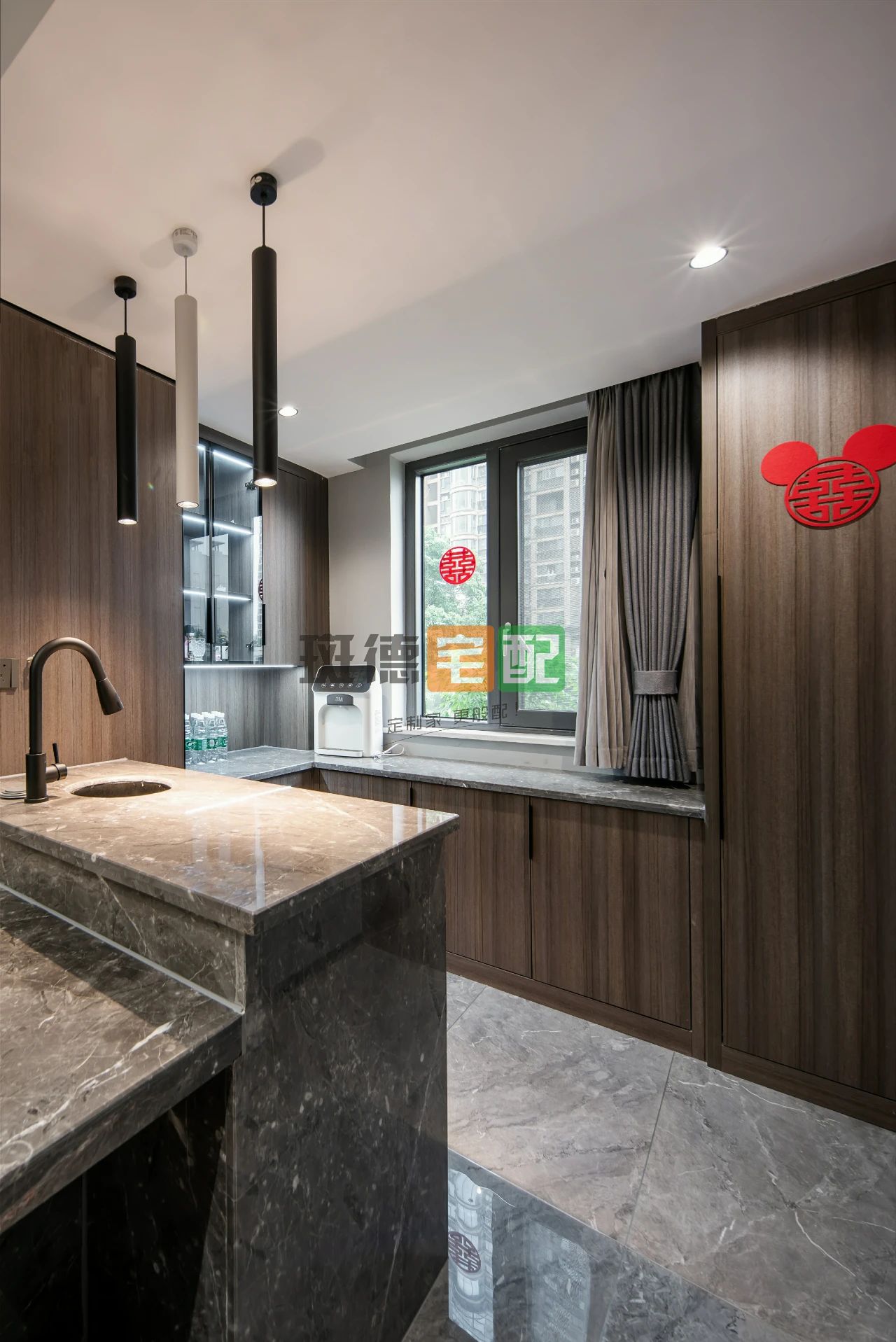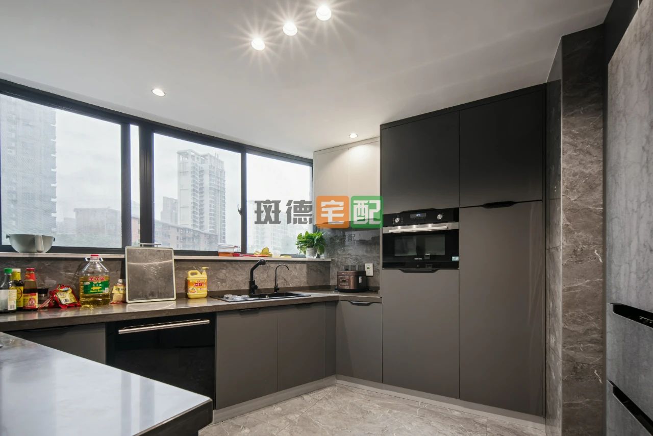 廚房內(nèi)容納對開門冰箱、洗碗機(jī)、蒸烤箱、中央用水系統(tǒng)、垃圾處理器等家電產(chǎn)品,使該生活區(qū)擁有原廚房所不具備的收納空間,分區(qū)合理,功能全面。