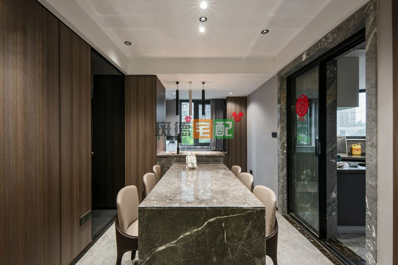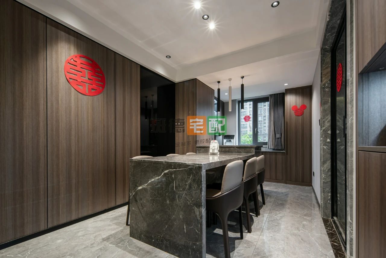 對餐廚空間墻面作飾面和鏡面處理,整體協(xié)調(diào),很有質(zhì)感。