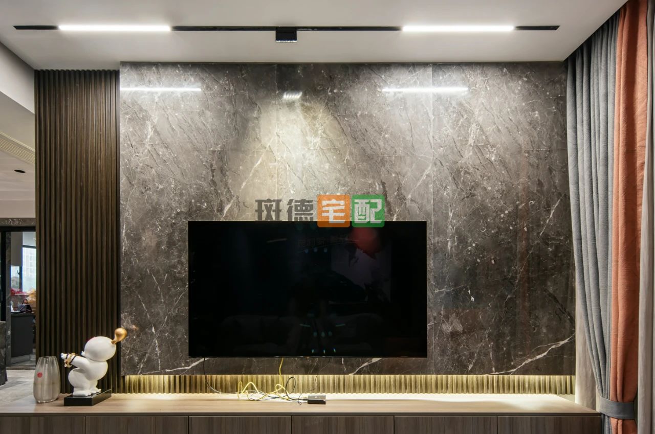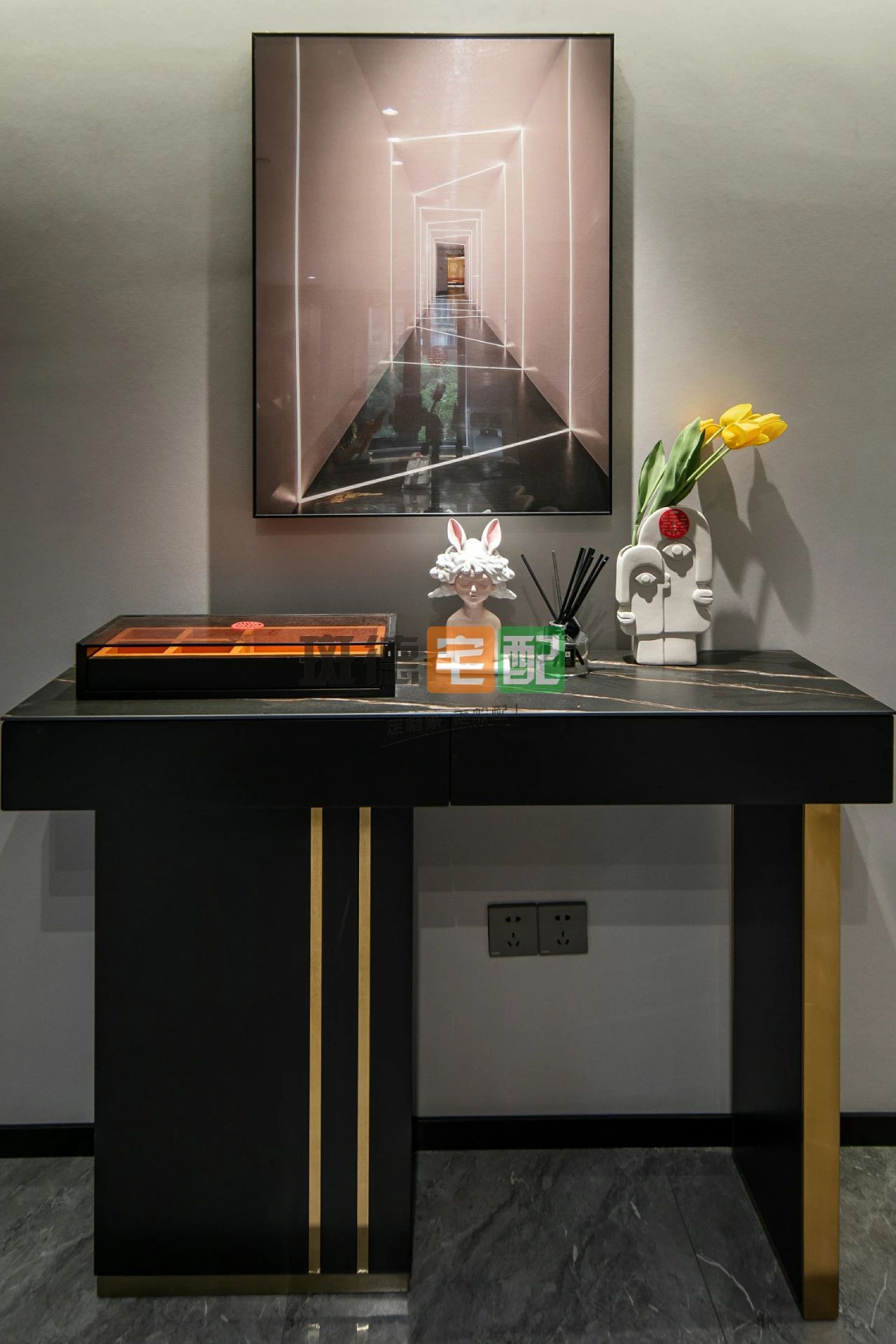 入戶端景的處理,既讓客廳電視墻和沙發(fā)墻更對稱,也讓端景和沙發(fā)背景更顯立體。不論材質(zhì)的比較,還是層次的變化,都顯得更加豐富。