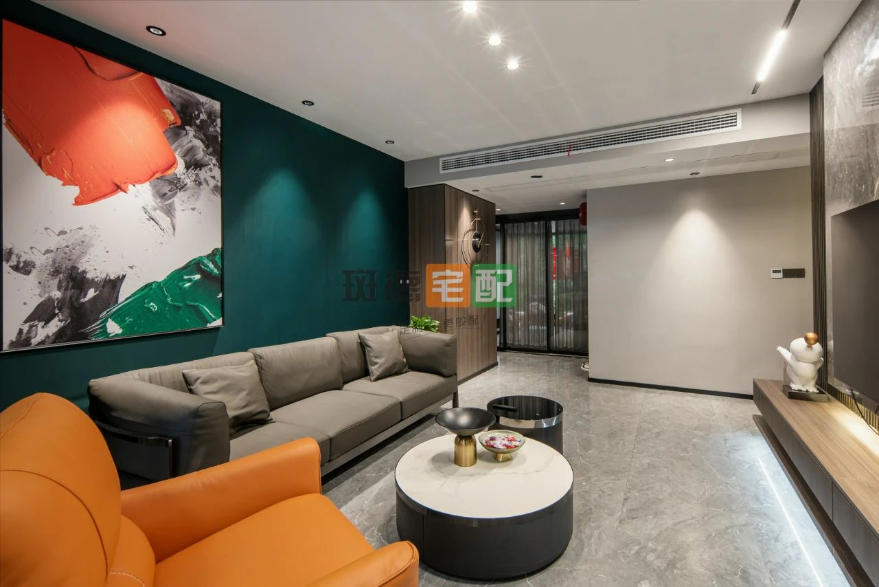 沙發(fā)背景選用了深綠色墻布,與護(hù)墻板搭配,起到材質(zhì)對比、互相提亮的效果,讓空間更具視覺沖擊力,更沉穩(wěn)顯檔次。