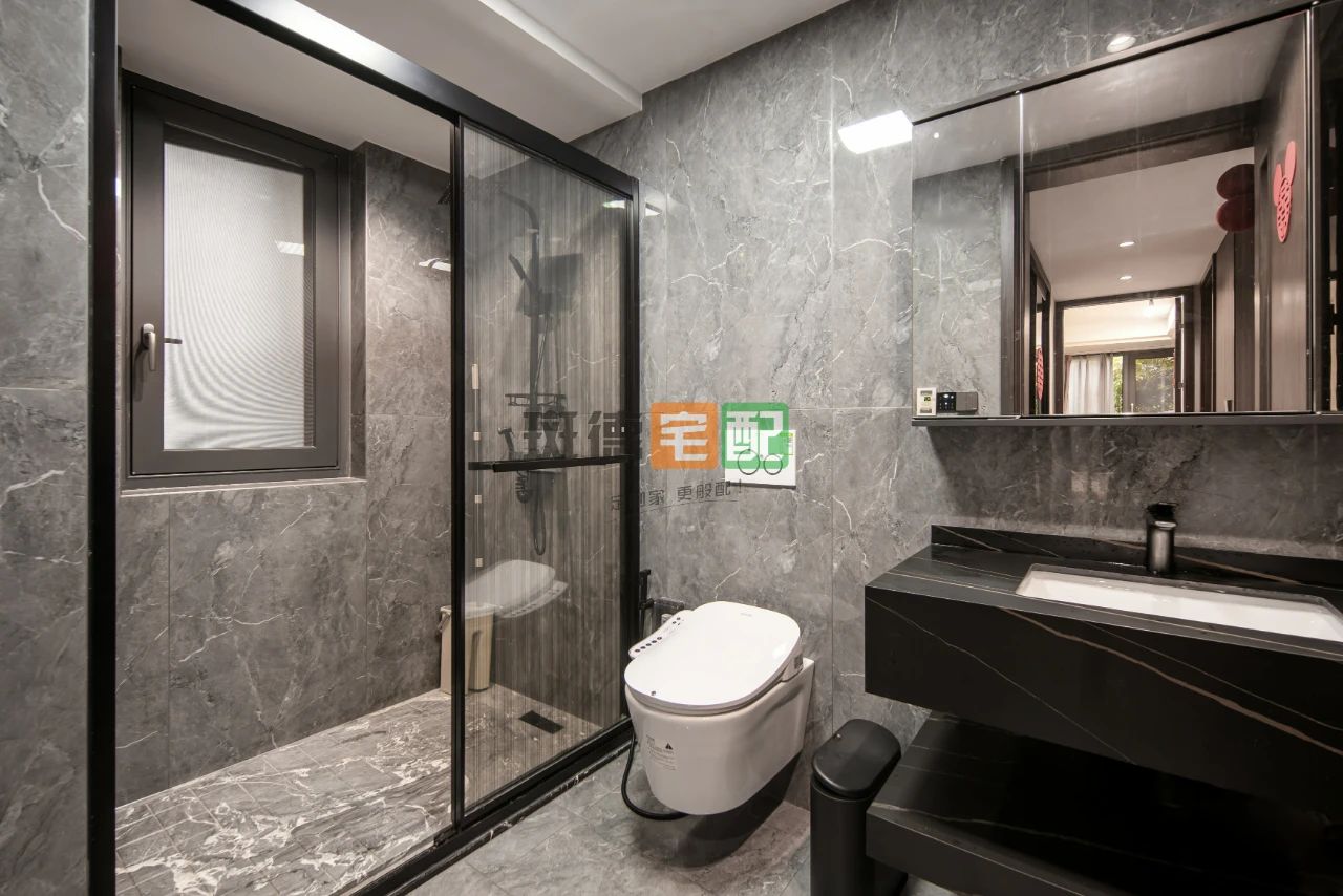 主衛(wèi)部分空間借用給衣帽間之后整體空間異形,為了讓原本被縮減后的衛(wèi)生間不顯局促,在原有飄窗處設(shè)計淋浴房、洗手臺,采用連墻壁掛式馬桶,空間利用最大化。