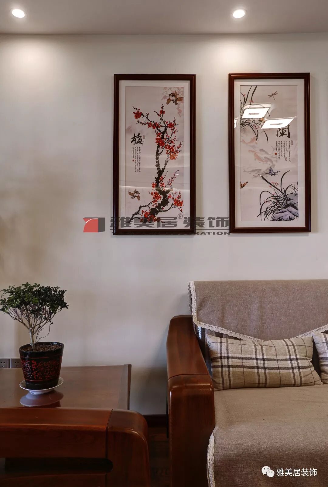 客廳與餐廳南北相通,室內(nèi)外情景交融?!鞍存I”頂燈,簡(jiǎn)單的家具讓所有焦點(diǎn)都聚集這一塊大框山水畫上。