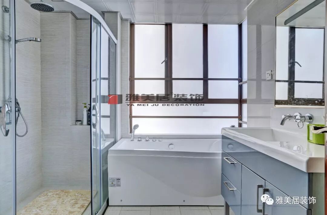 衛(wèi)生間大小足以放下浴缸加整體淋浴房。整體以灰白為主,加上陽(yáng)光的通透,打破了衛(wèi)生間閉塞的感覺。