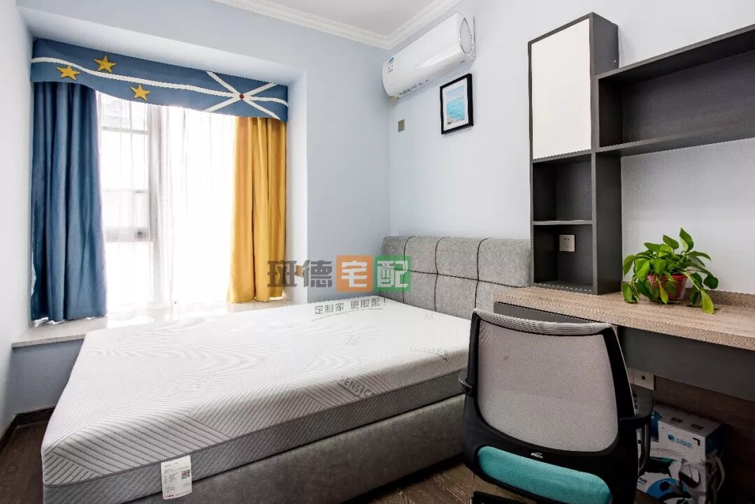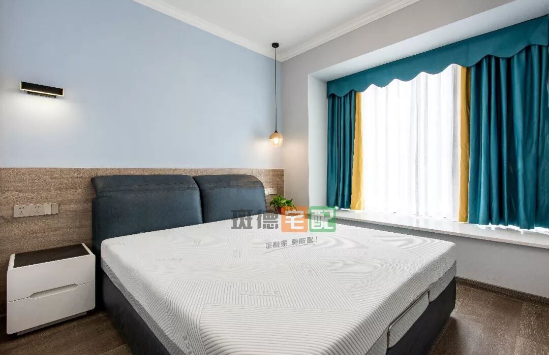 淡藍色墻及木地板的臥室,搭配藍黃窗簾,選擇床頭吊燈及軌道壁燈搭配,增加美感。床頭背采用斑德宅配腰墻護墻板,襯托出靜謐的氣質(zhì)。