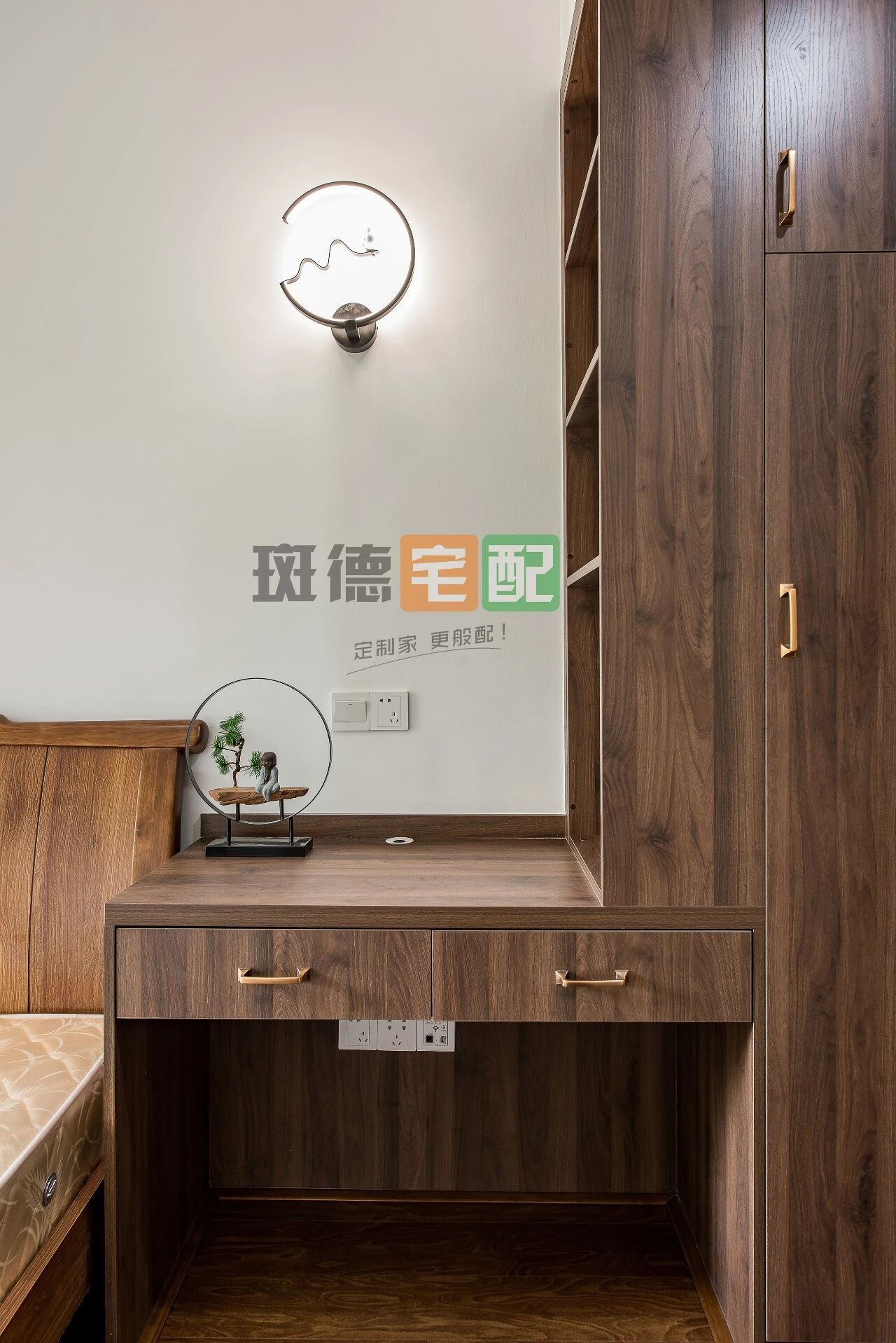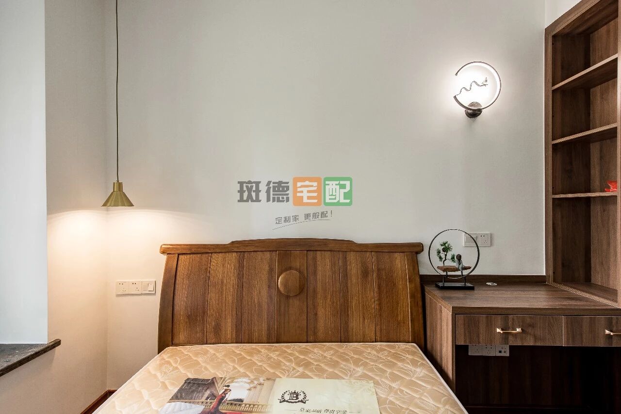 很多人認為新中式風會把房間裝得略顯老氣,其實不然,次臥在書桌柜上方設置了一個圓弧造型壁燈,兼具美觀和實用的功效。