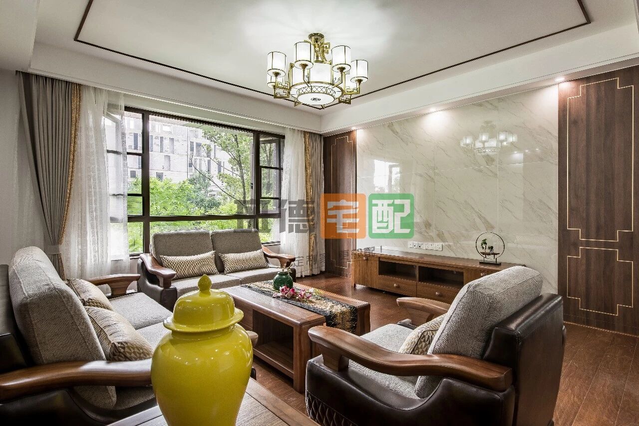客廳背景墻采用大理石和斑德宅配護墻板結合,與裝飾柜相呼應。