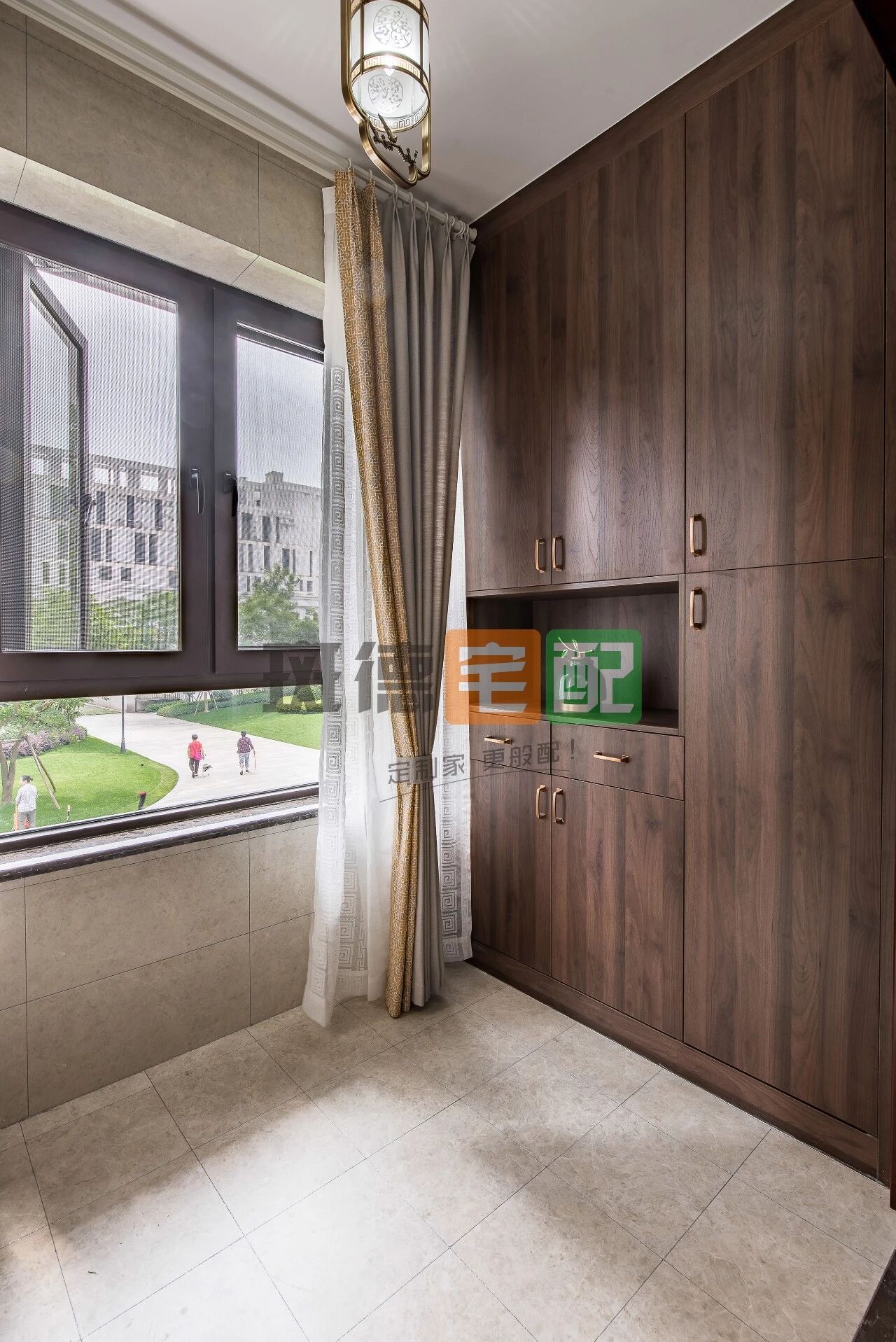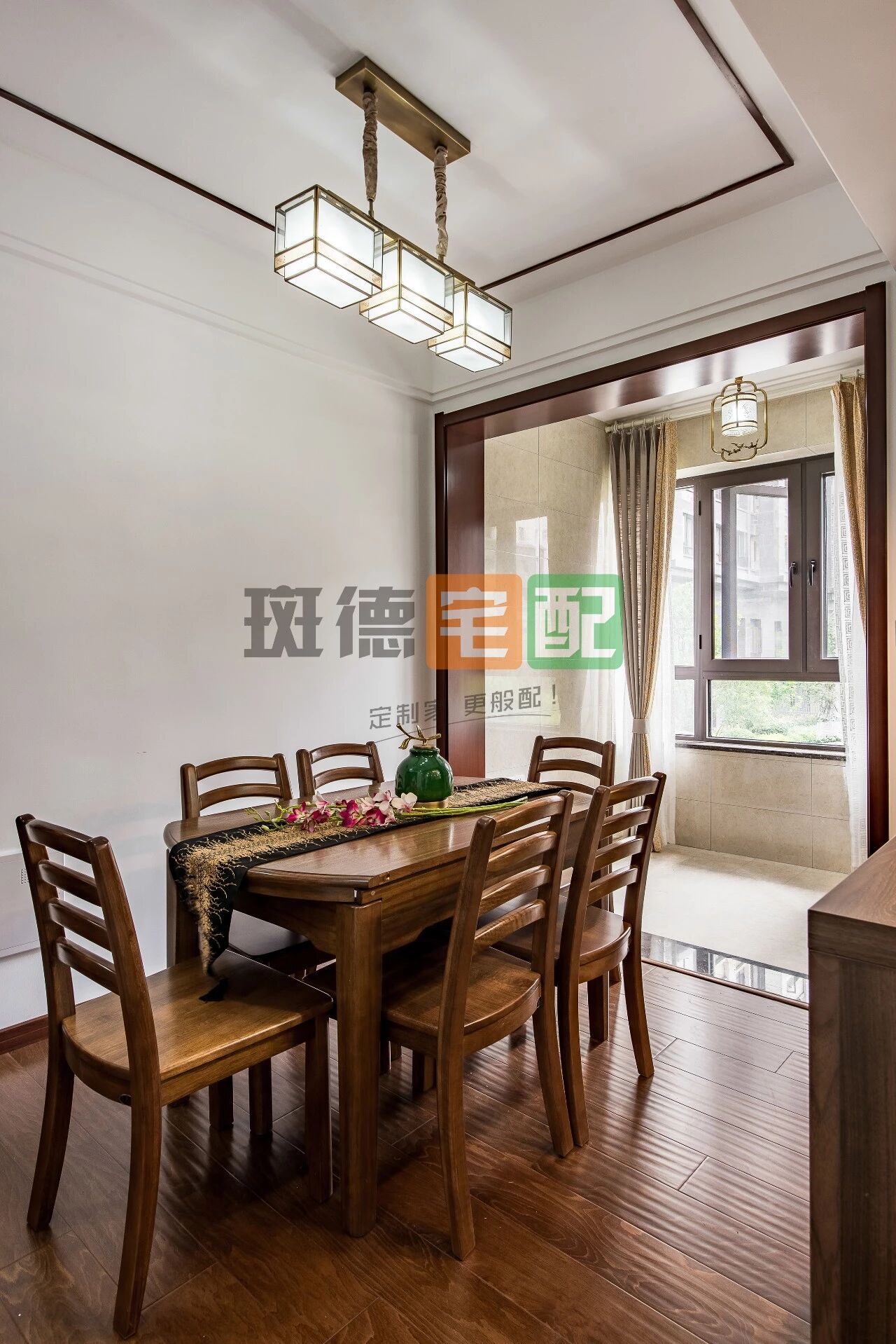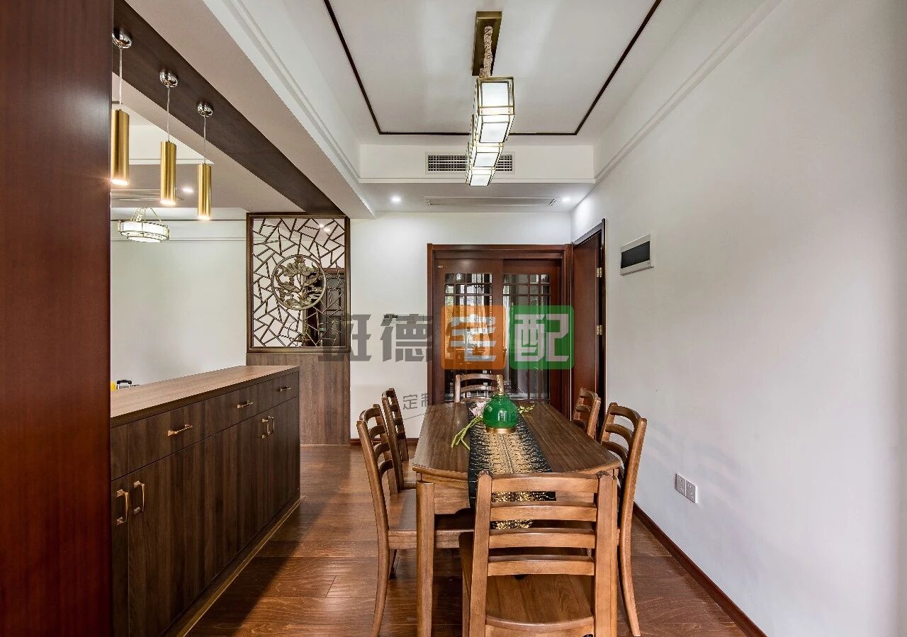 整體色調與大理石相呼應,清新雅致,傳統(tǒng)實木餐桌搭配新中式元素十足的吊燈,陽臺打造儲物展示柜,提供更多收納可能。