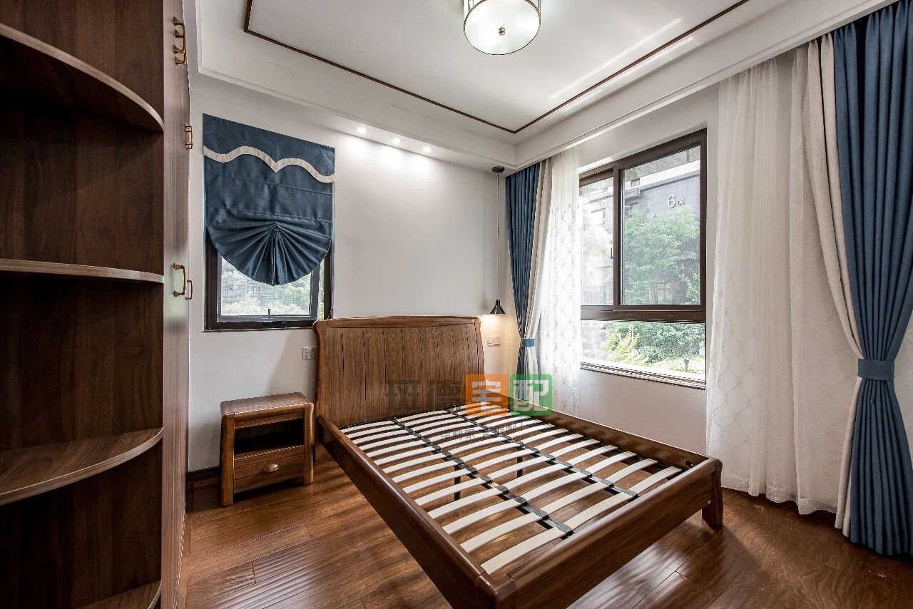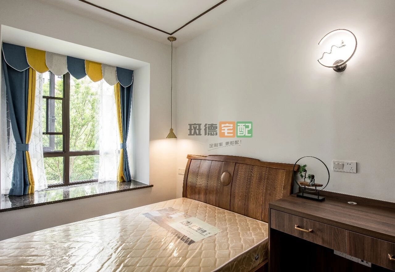 臥室房門改造后,書桌柜與衣柜采用斑德宅配定制,布局巧妙銜接,新中式的樸實典雅、恬淡自然呼之欲出。因為有飄窗臺,窗簾選用藍黃色,讓房間變得活潑起來。