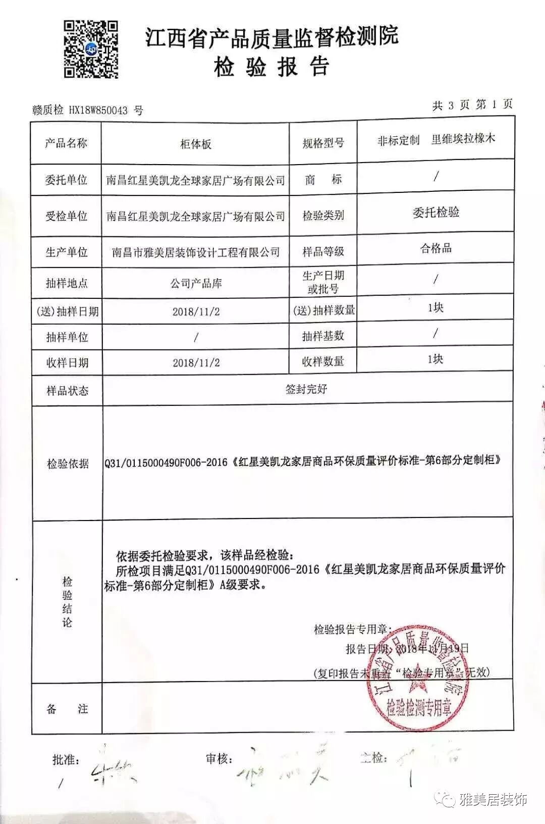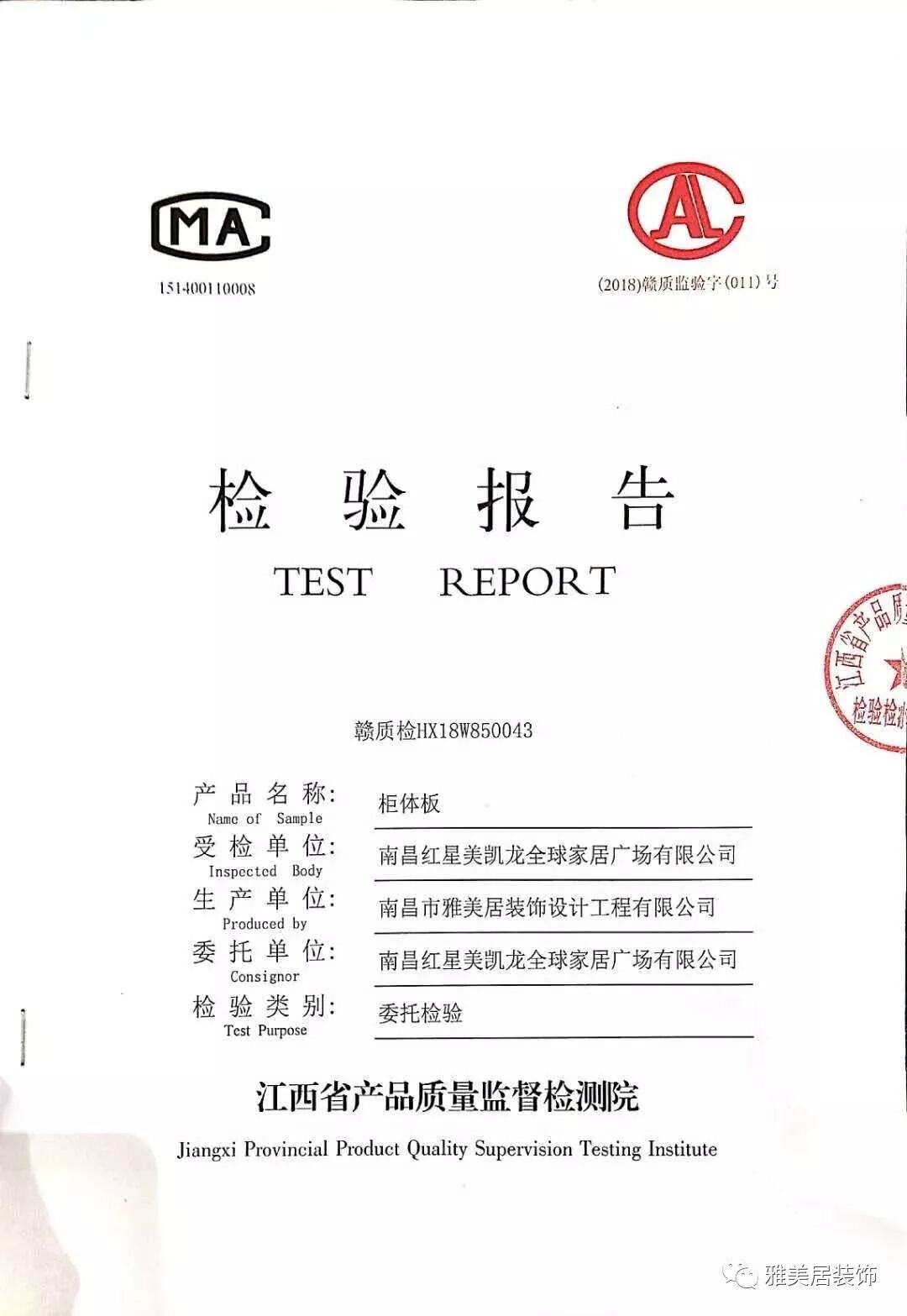 ▲雅美居斑德宅配定制板材檢驗(yàn)合格文件