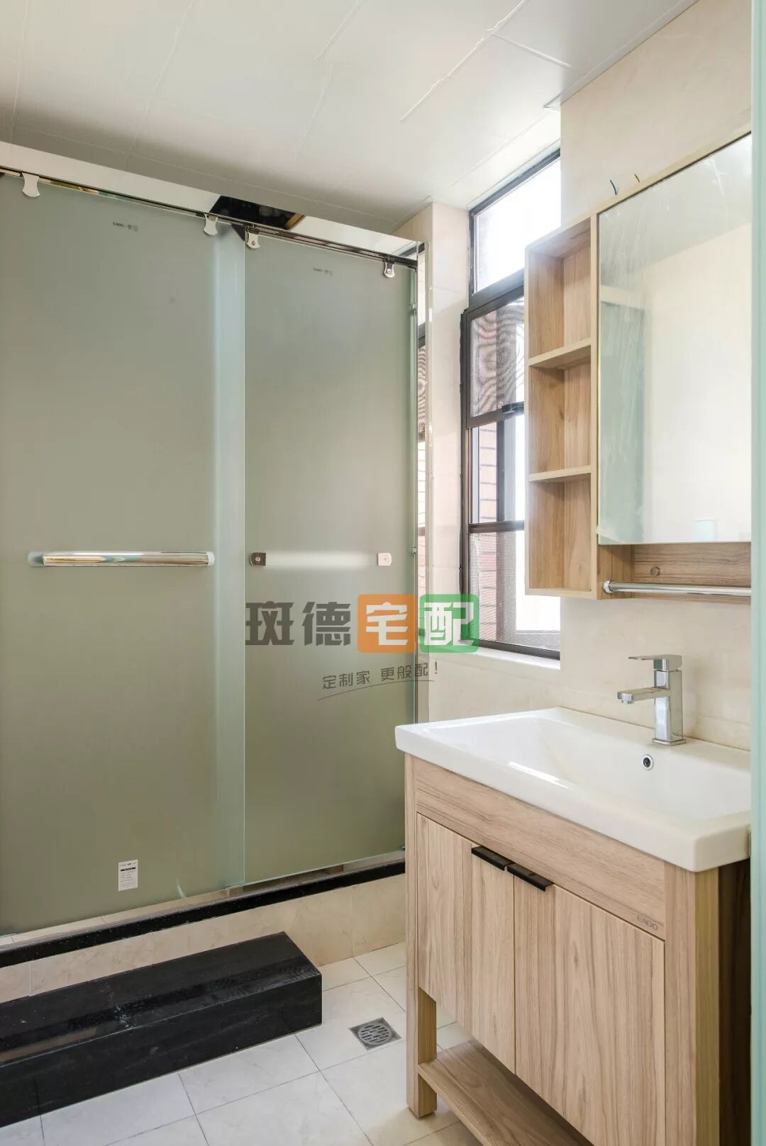 白色瓷磚搭配原木浴室柜讓衛(wèi)生間看起來簡單清新,谷倉門顏色與客廳整體風格也很搭。