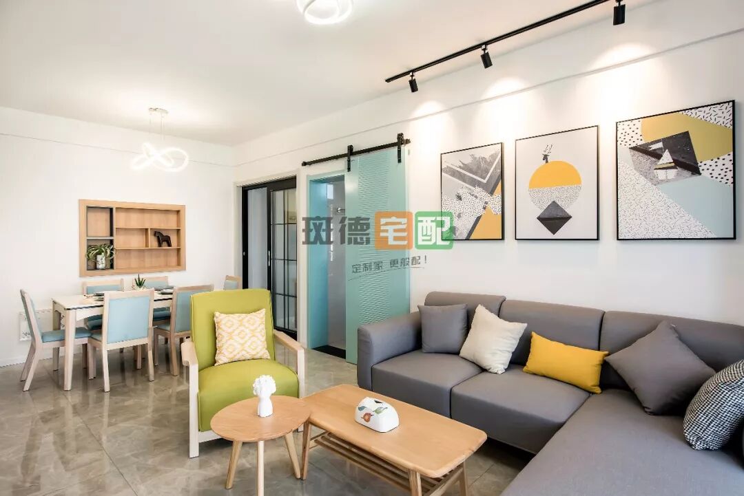 電視背景墻與柜門的白形成一個虛實結(jié)合的效果。布藝沙發(fā)區(qū)的裝飾畫和原木茶幾,使軟裝搭配元素形成統(tǒng)一,滿滿的溫馨感。