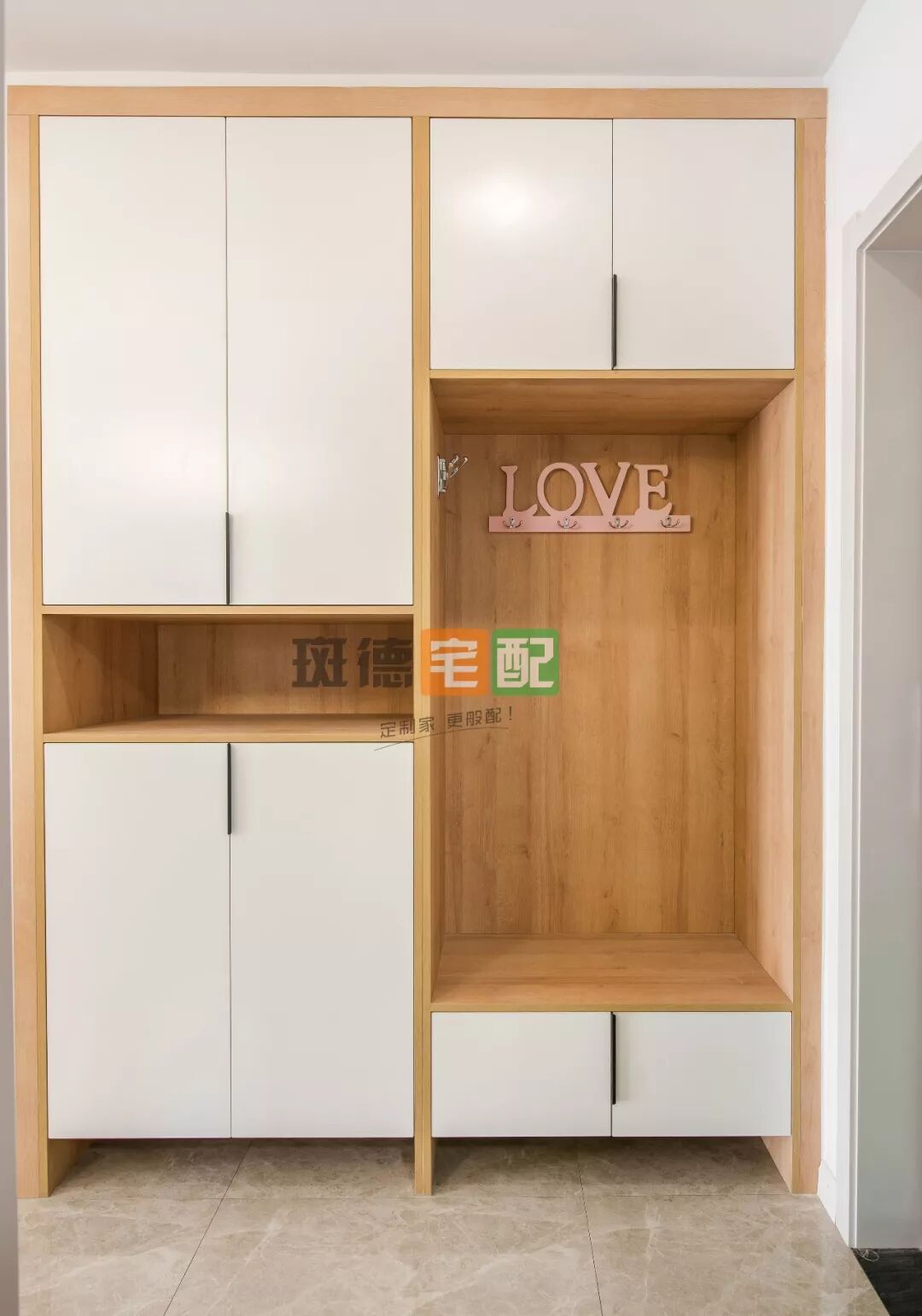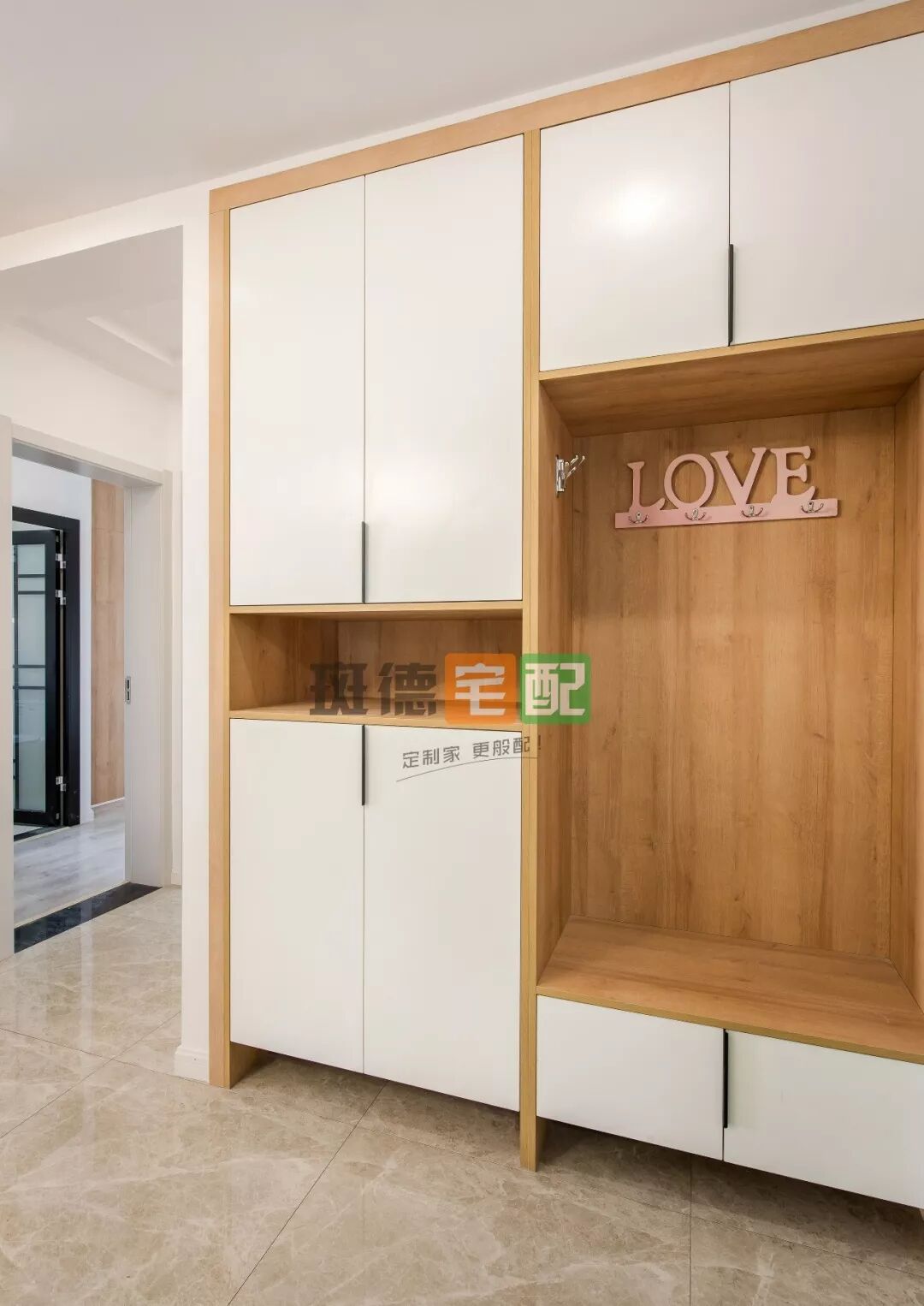 可以看到,入戶處定制一組簡單的鞋柜和換鞋凳,還設(shè)置了包包、衣物掛放區(qū)?!绊斕炝⒌亍钡墓褡?,收納性超強,下面留空放拖鞋,很方便。