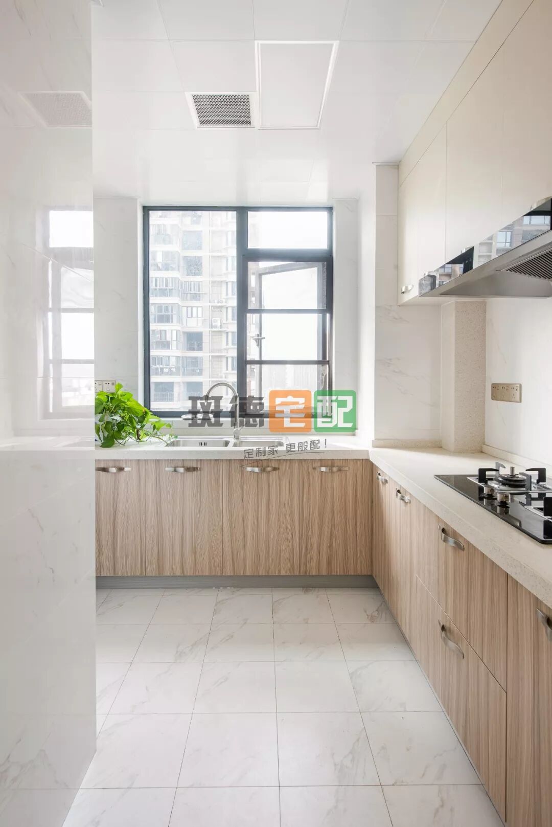 在原戶型上,主衛(wèi)在廚房里面,進出不方便。經(jīng)過移墻改造,把廚房與衛(wèi)生間隔開。安裝一扇谷倉門懸掛于衛(wèi)生間外,節(jié)省空間。