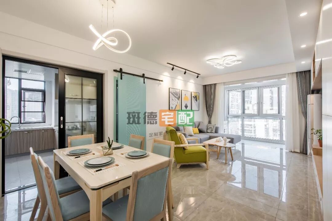 原木色餐桌映襯藍色餐椅,透著現(xiàn)代清新的文藝感,即使正對廚房門進出,也不會顯得擁擠。