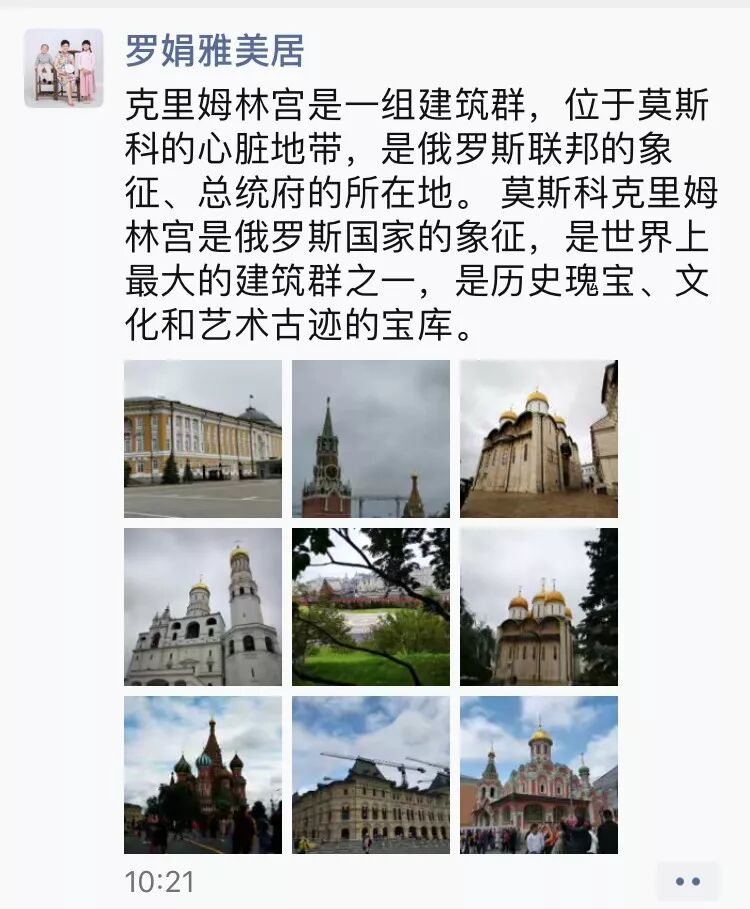 “莫斯科飛機(jī)9小時(shí),時(shí)差5小時(shí),溫度比國(guó)內(nèi)低20多度,避暑的好地方,獨(dú)特的建筑風(fēng)格。很神奇的是,所有建筑上的涂料能長(zhǎng)時(shí)間保持不臟。”