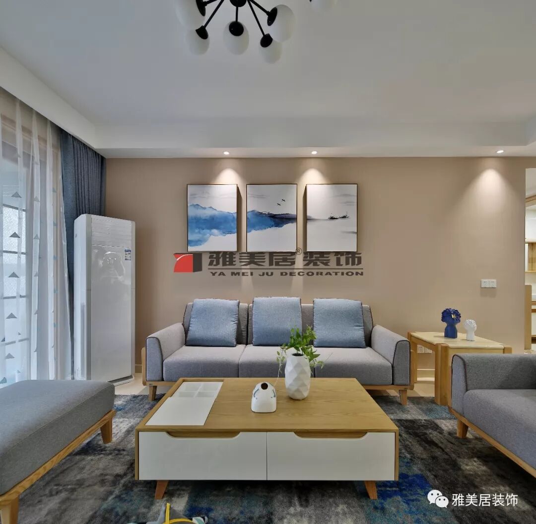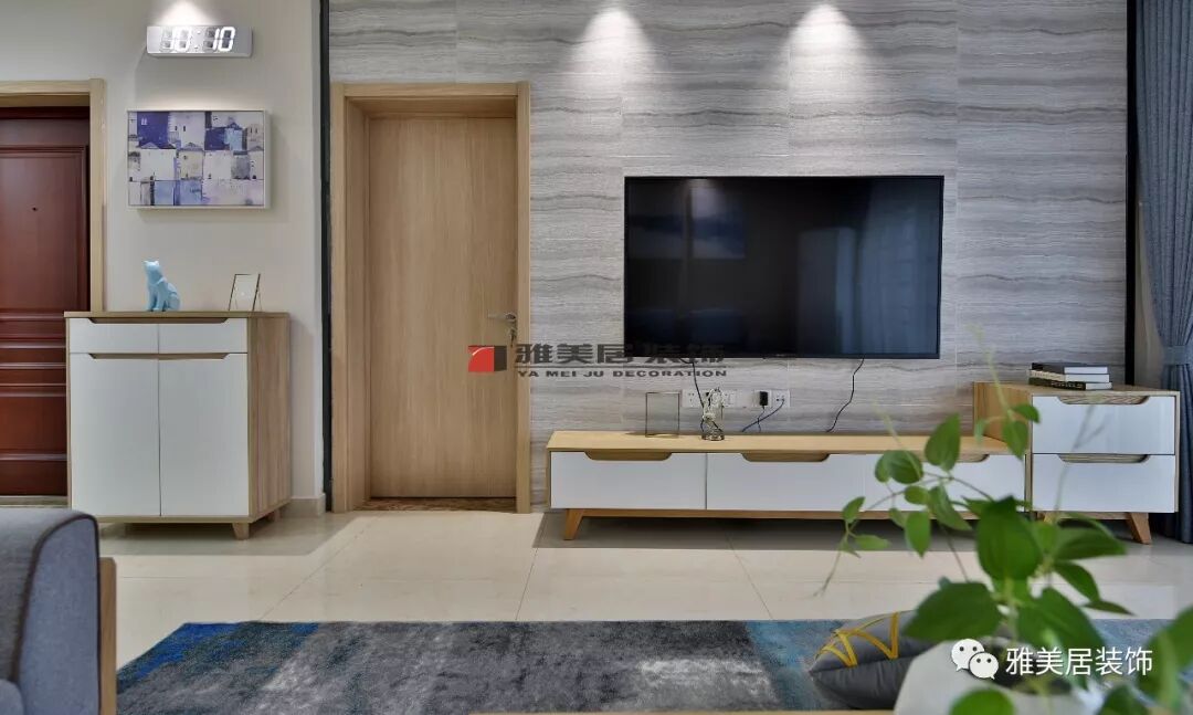 通過(guò)軟裝元素體現(xiàn)其現(xiàn)代風(fēng)格,簡(jiǎn)約壁燈、布藝沙發(fā)背景掛畫和脈絡(luò)狀的地毯,時(shí)尚大氣。采用木化石板材定制背景墻,既不會(huì)搶去電視的焦點(diǎn),又大方耐看。