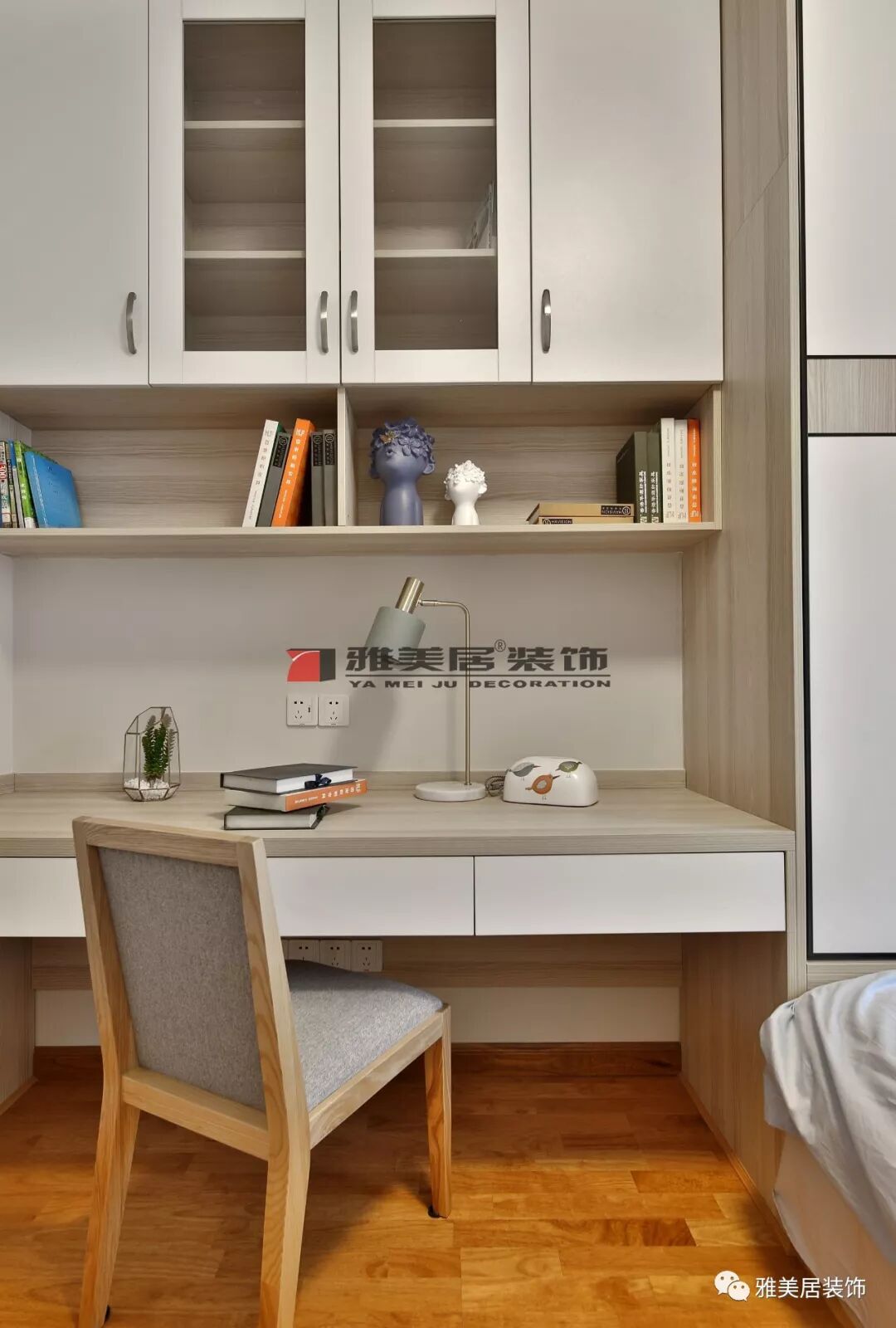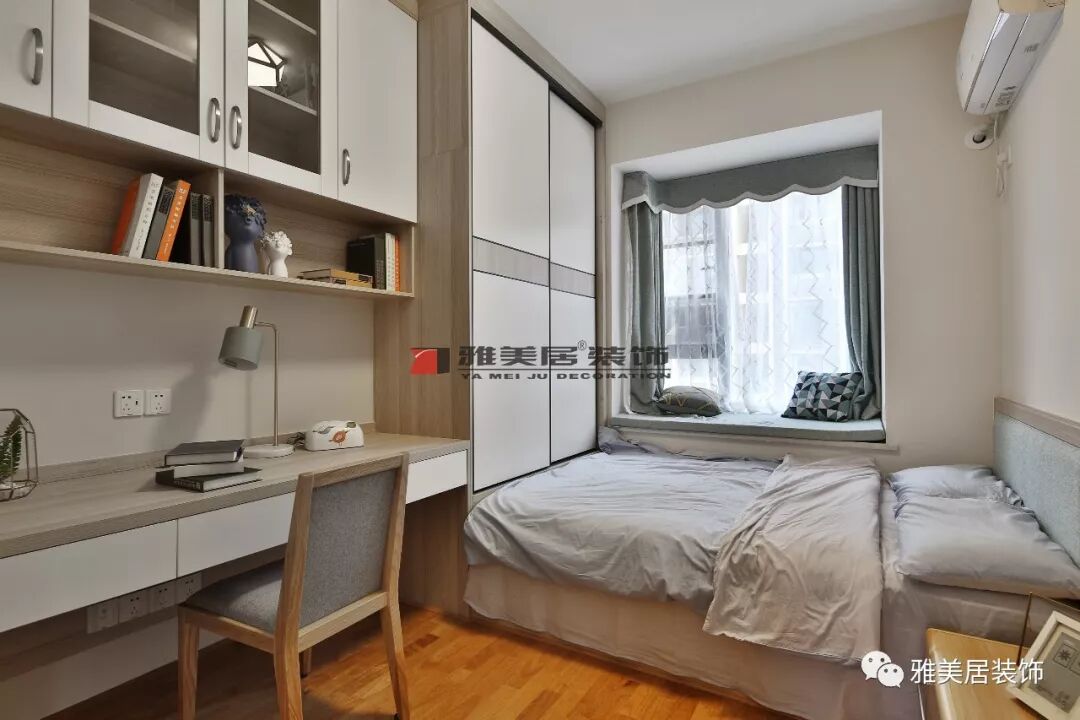 書桌收納柜直接與衣柜拼接,將功能區(qū)域集中在房間的一處,留有更多的可使用空間。