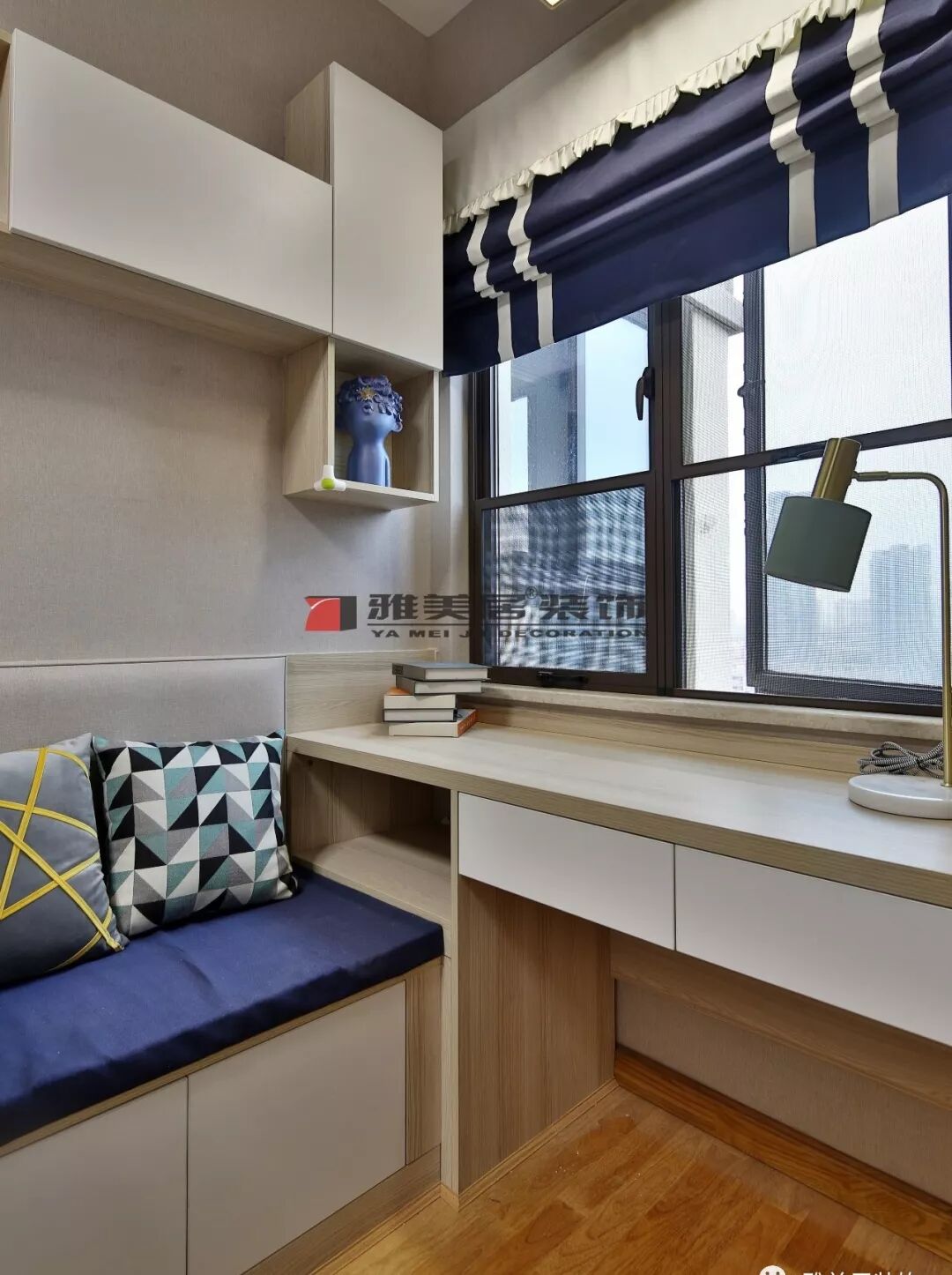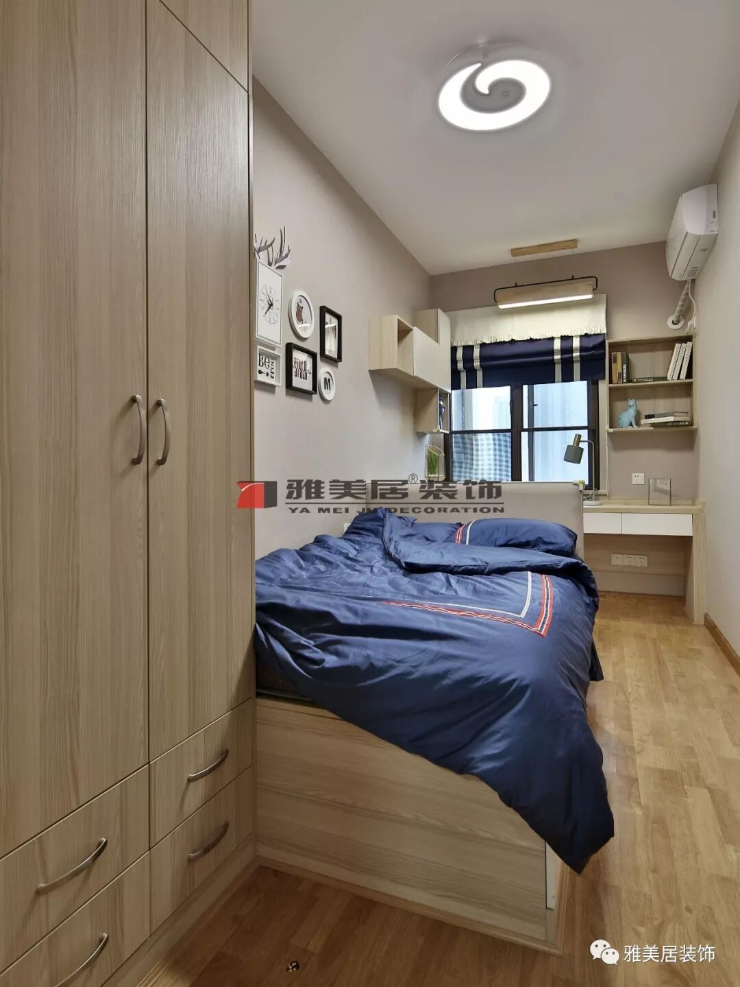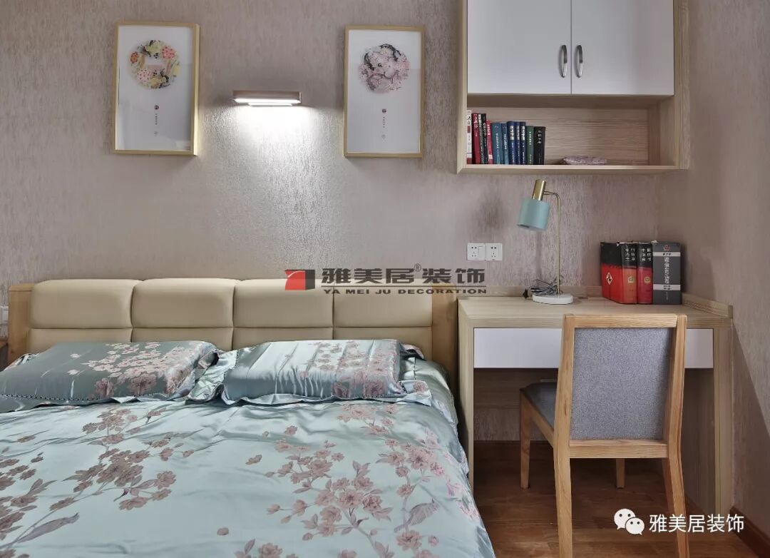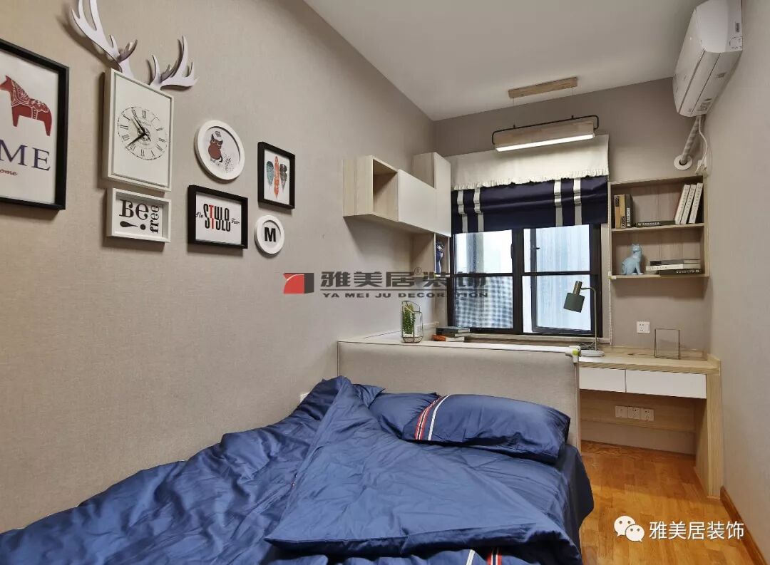 兒童房戶型狹長(zhǎng),因此打造一組斜體衣柜,掛畫以動(dòng)物品圖案裝飾,滿足兒童喜好。書桌與卡座、吊柜組合設(shè)計(jì),增加了兒童房使用空間。
