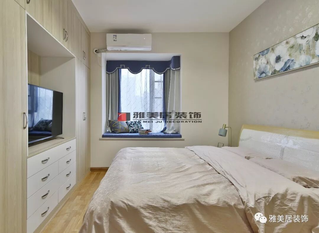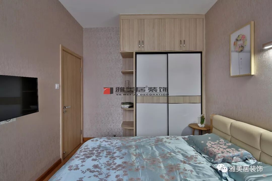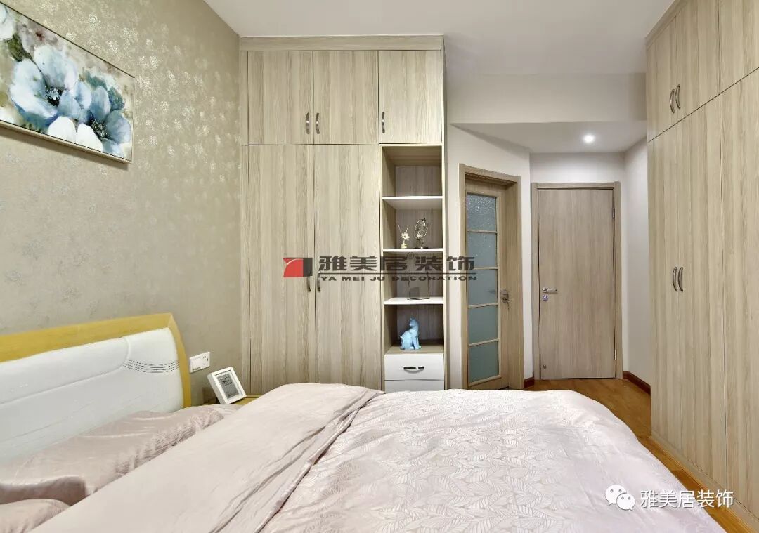 主臥內(nèi)含衛(wèi)生間,為不浪費(fèi)主衛(wèi)半面墻,定制到頂衣柜及展示柜結(jié)合。過(guò)道將電視柜和儲(chǔ)物柜相連在一起,保持本該有的柜體收納功能,又能有效節(jié)省臥室空間上的利用。