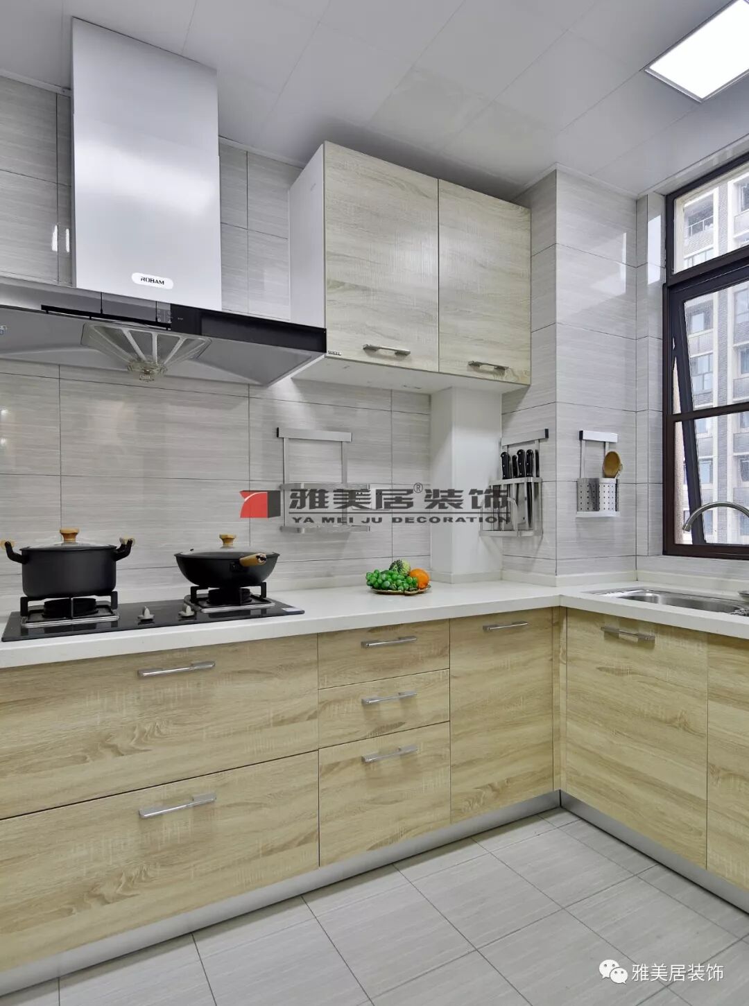整體內(nèi)嵌式櫥柜,在吊柜中間安裝直通式抽油煙機(jī),不浪費(fèi)一點(diǎn)兒空間的利用,整體搭配簡(jiǎn)潔大方又時(shí)尚。