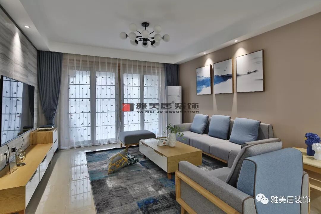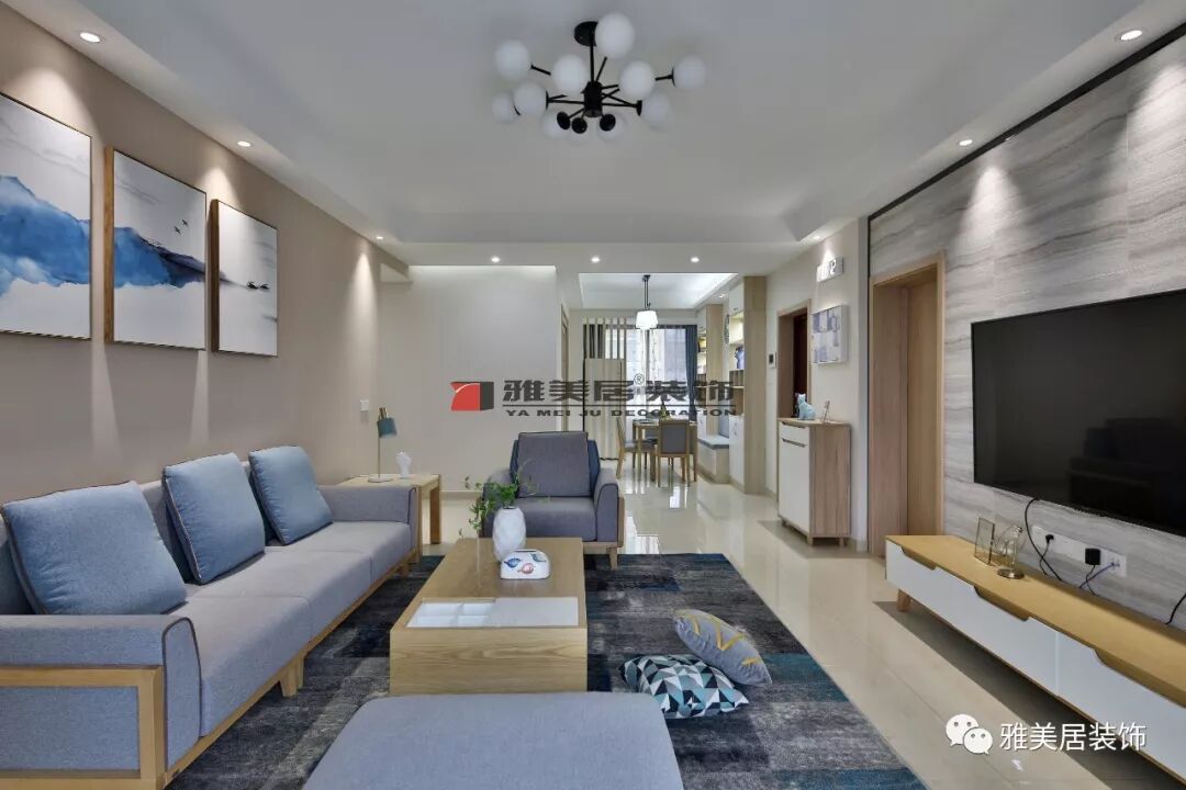 客廳設(shè)計(jì)主打較為舒適的視覺效果,無(wú)吊頂,四周設(shè)計(jì)燈帶。整體空間用色深淺搭配,偏灰藍(lán)。