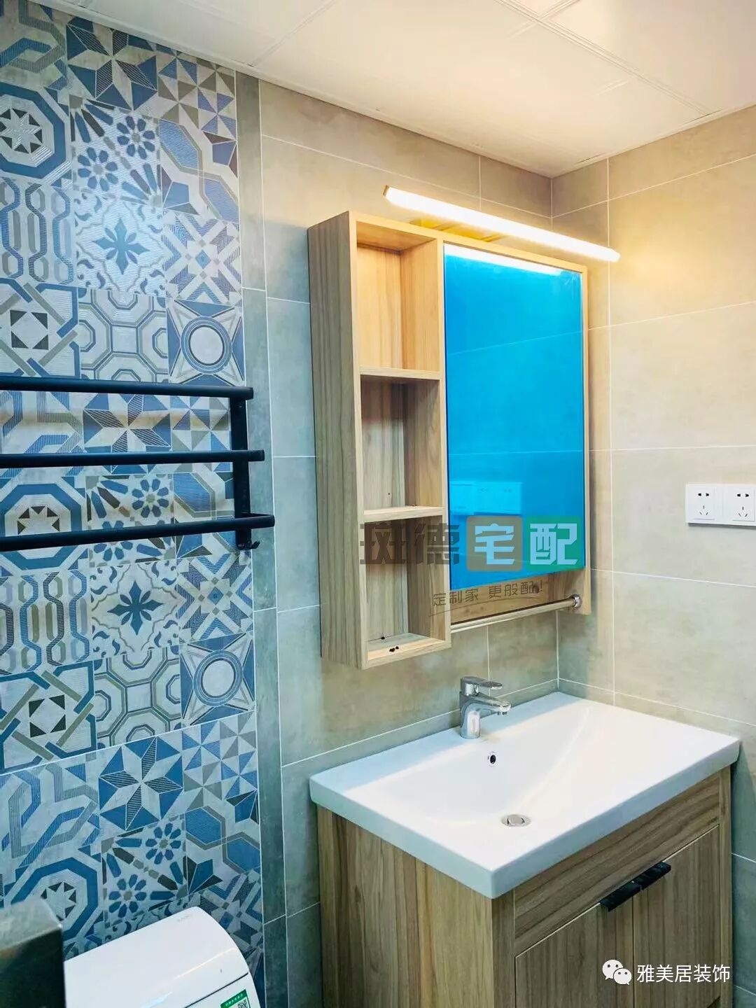 設(shè)計(jì)師還在浴室柜上方設(shè)計(jì)了燈光,考慮到女主人使用,很有可能會(huì)因?yàn)楸彻?,顯得臉色暗淡,不方便潔面、化妝或者洗護(hù),此時(shí)就需要單獨(dú)再安裝一個(gè)燈。