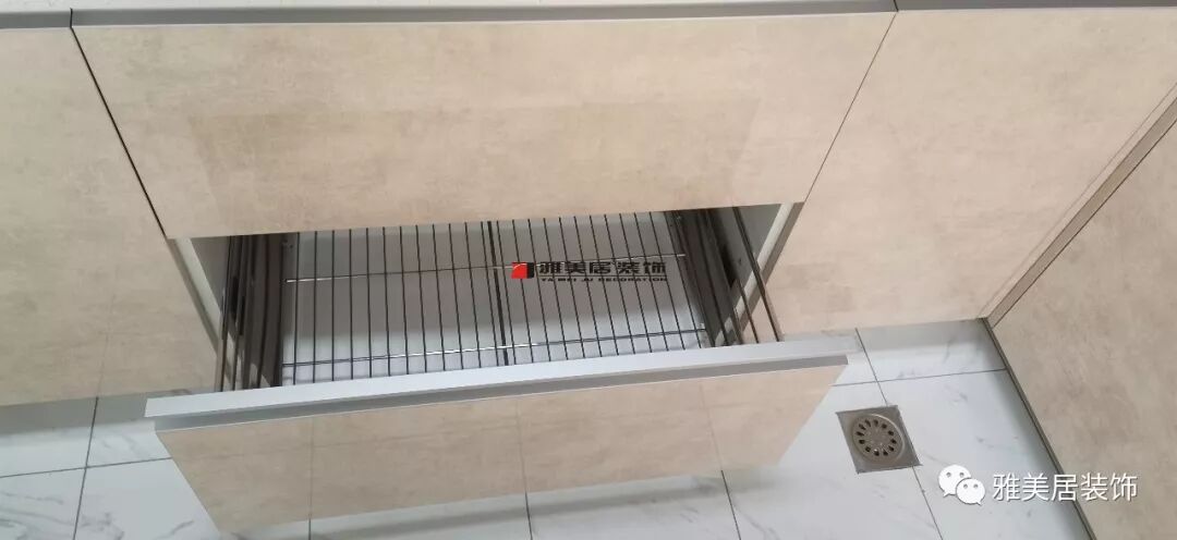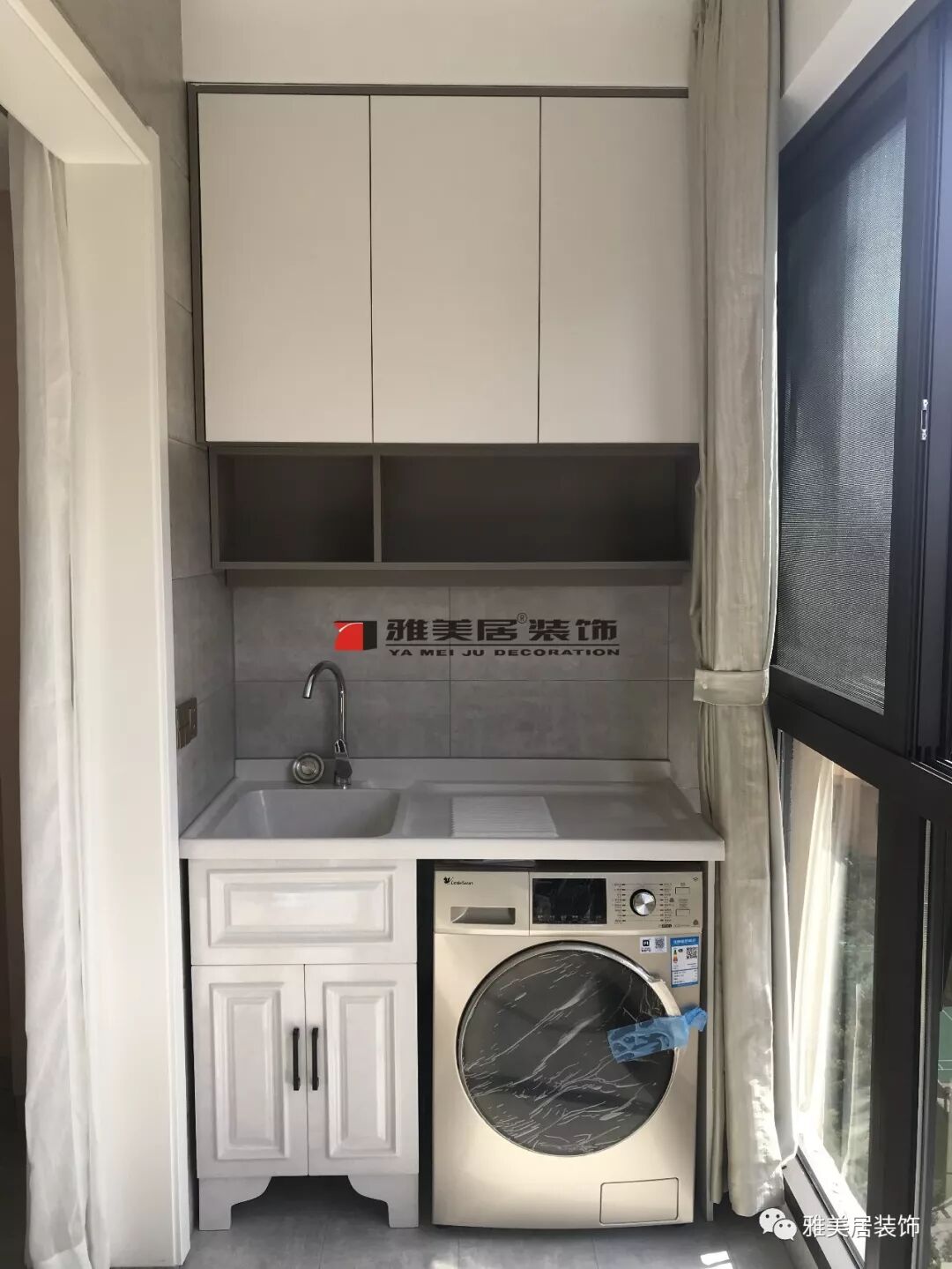 陽(yáng)臺(tái)吊柜采用石膏板封頂不易落灰,下方設(shè)置開(kāi)放柜更好放置洗衣粉,洗手液等物品,貼心的是柜子下還安裝了燈管、洗衣機(jī)柜一體設(shè)計(jì),空間得到高效利用。