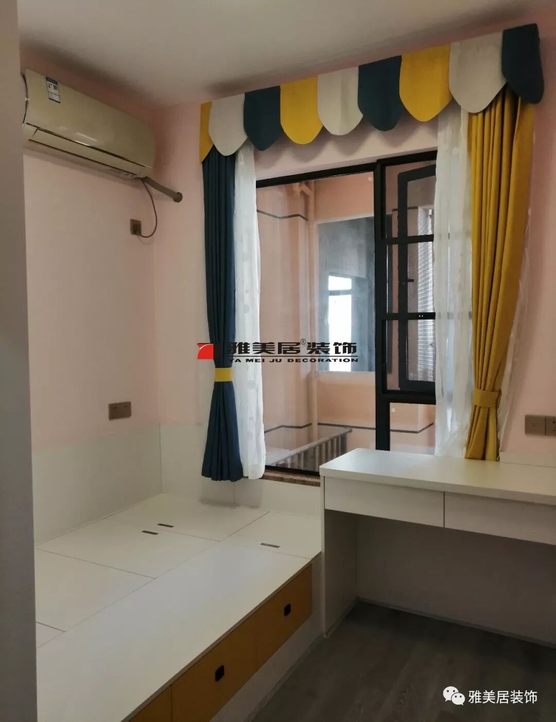 即使橫向面積有限,墻面空間還能進(jìn)行分割,中部留空+檸檬黃套框,與窗簾相呼應(yīng),還輕松解決小孩子玩具、書(shū)籍的收納問(wèn)題。