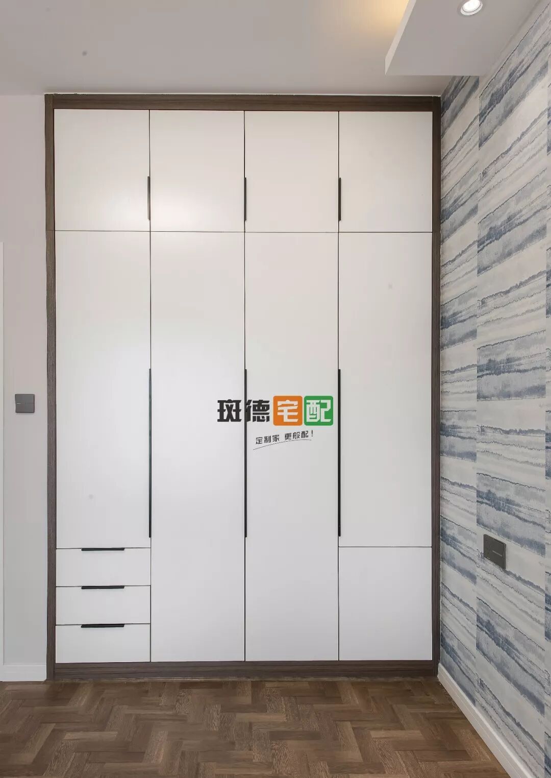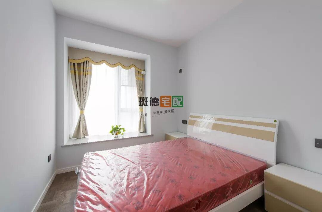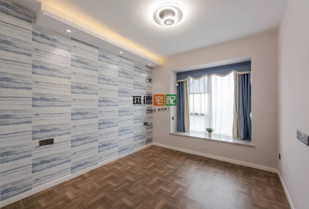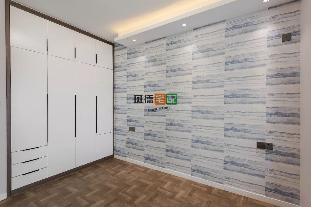 主臥以藍白色調(diào)為主,窗簾的藍色與窗簾相呼應,給人一種安靜、沉穩(wěn)的感覺。整面墻的定制衣柜比普通衣柜擴大了兩倍收納空間。