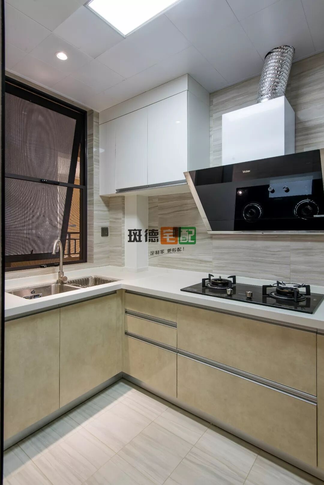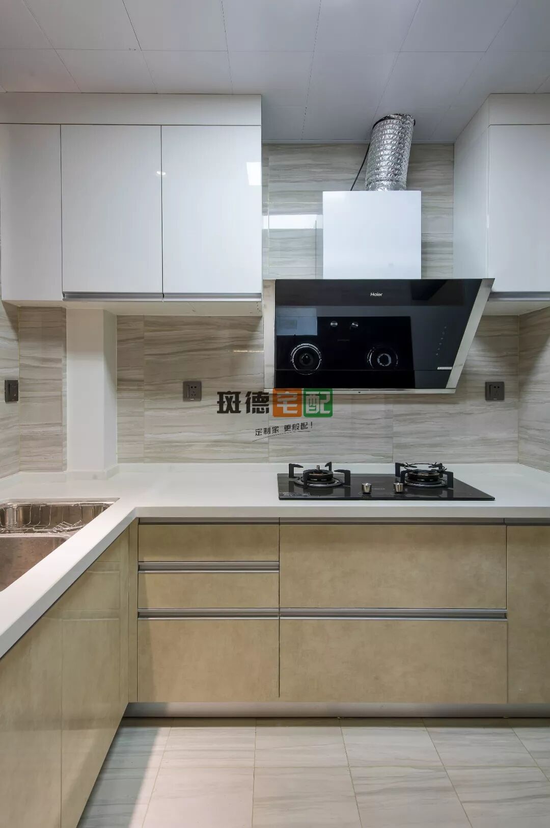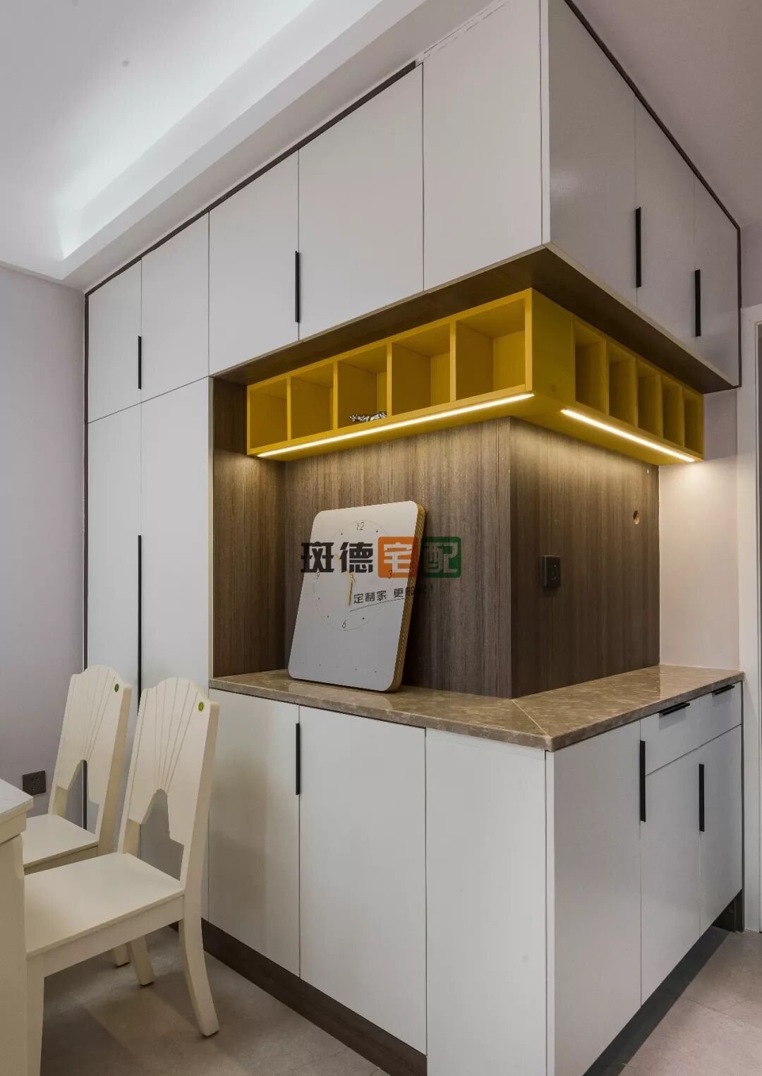 到頂柜+吊柜布局,中部設計成大理石臺面,一方面因為緊鄰餐廳,沾水易擦拭,;同時方便進出臨時存放包包、鑰匙等。