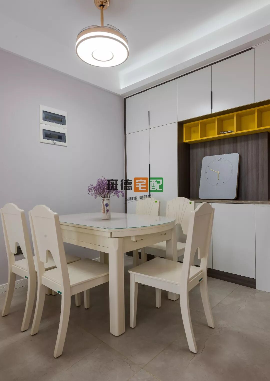 遵循就近收納原則,既能滿足日常用餐使用,也能夠分擔一些廚房的大物件收納。精心挑選的花搭配圓形吊燈高級感滿滿。