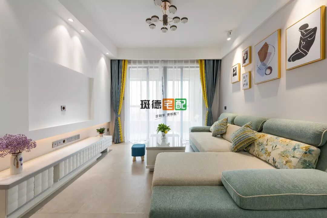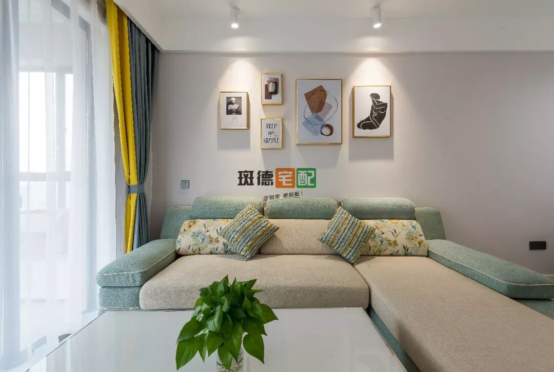 抽象的沙發(fā)掛畫襯托淺綠色沙發(fā)更添幾分慵懶的氣息,與旁邊長勢極好的綠植整體看起來很和諧。