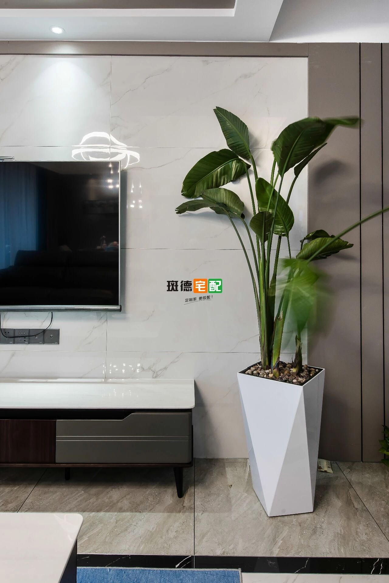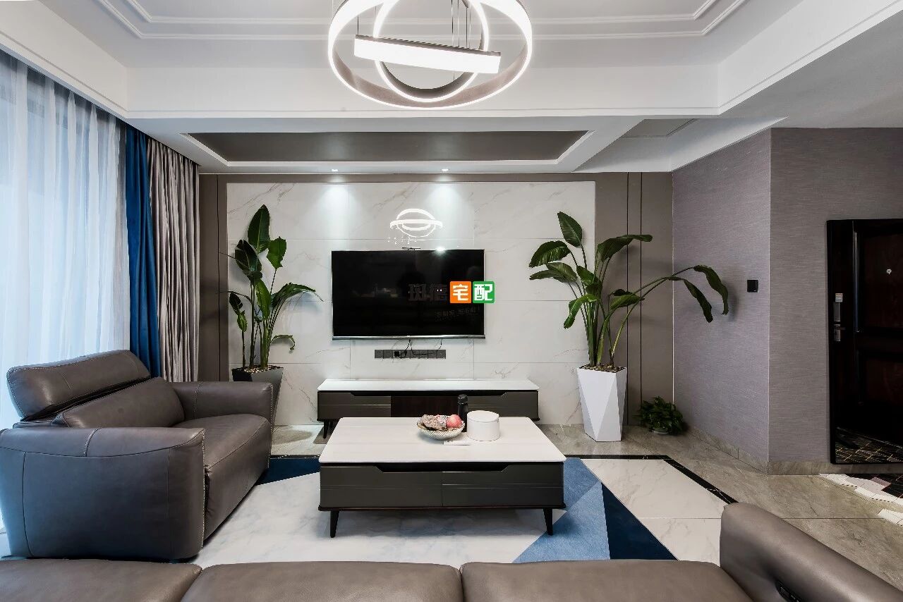 仿爵士白大理石地磚與電視背景墻以及餐桌、茶幾、電視柜臺面相呼應(yīng),更顯空間整潔。