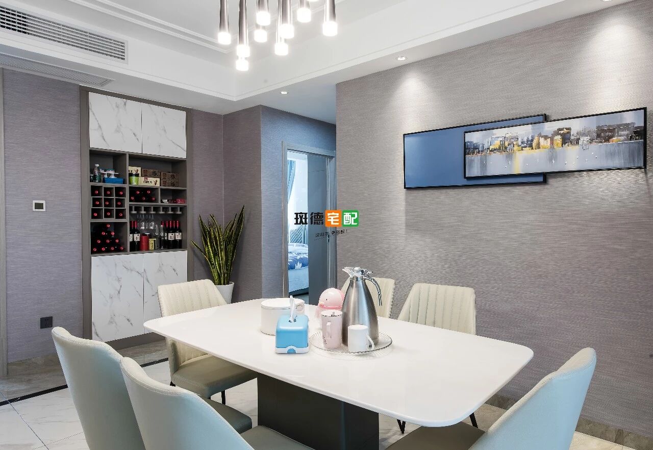 選擇有質(zhì)感的簡約餐桌,搭配細(xì)腿椅子及奢華銀吊燈,用餐體驗的檔次瞬間提升。