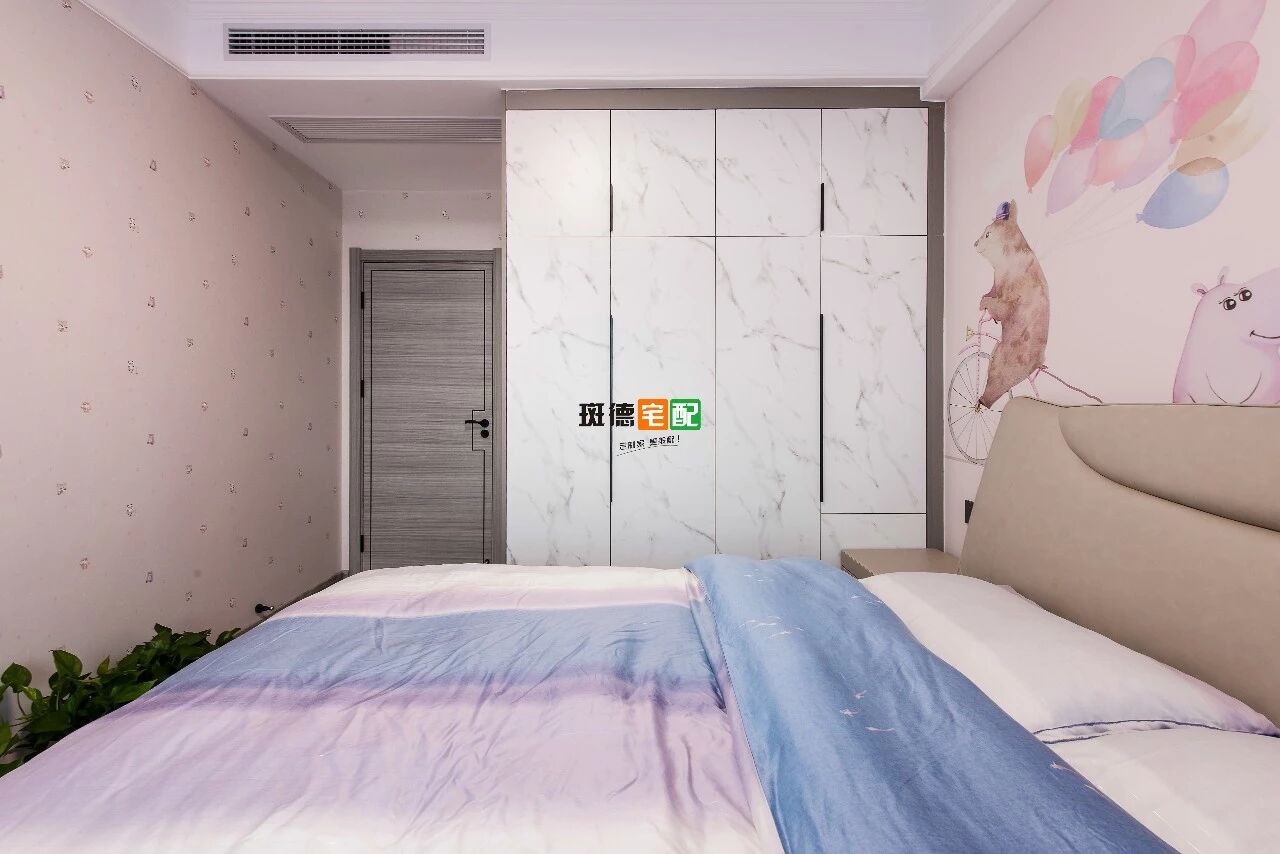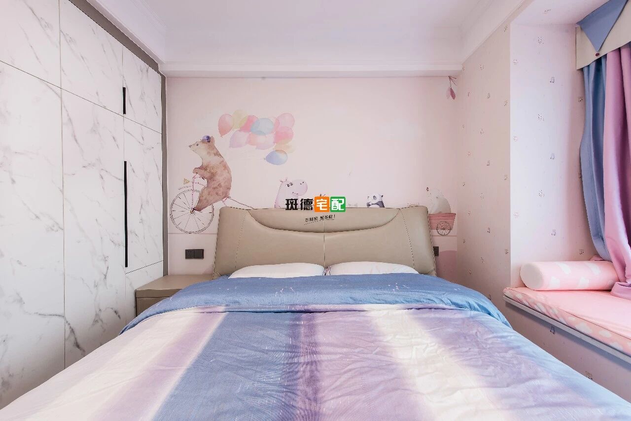 設(shè)計師在這個女孩房的設(shè)計上,大膽采用粉色的小動物墻布進行滿鋪,在窗簾上也采用了粉色與之相呼應(yīng)。