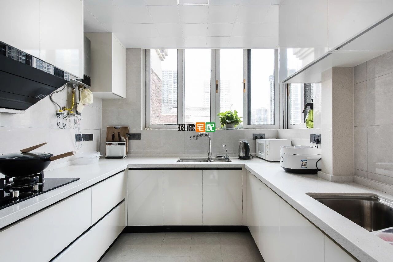 簡約的黑白色調(diào),U型布局操作方便,采用全通透的黑框推拉門,干凈利索。
