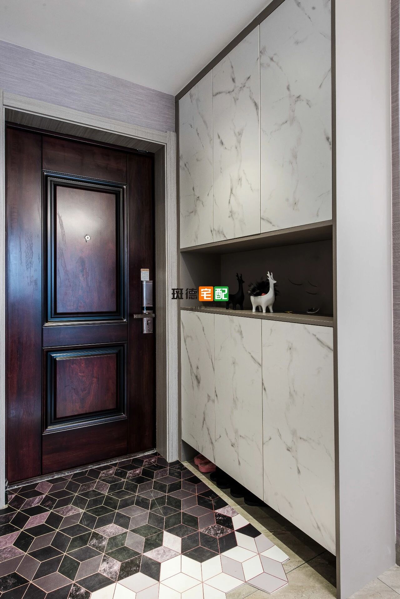 安裝光線更集中的射燈,及一側(cè)的穿衣鏡為出門前整理妝容提供便利。多邊形磚式地毯鋪上,增強造型感,從進門那一刻便享受精致的溫柔。