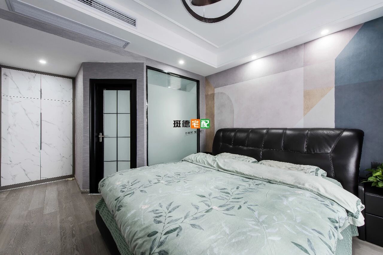 主衛(wèi)與主臥過道狹長,把衛(wèi)生間門改為斜角,墻體利用定制儲物衣柜,與墻融為一體。