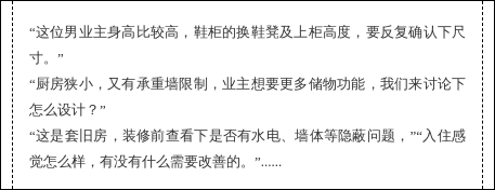 對于要進(jìn)行舊房翻新的業(yè)主來說,深度服務(wù)帶來的安全感是“在不了解自家房屋情況下,沒有自行進(jìn)行拆除,專業(yè)驗房幫我查找隱患,先考慮安全問題,再考慮我家的美觀性及空間的合理拆分。”