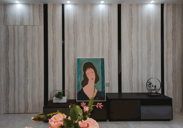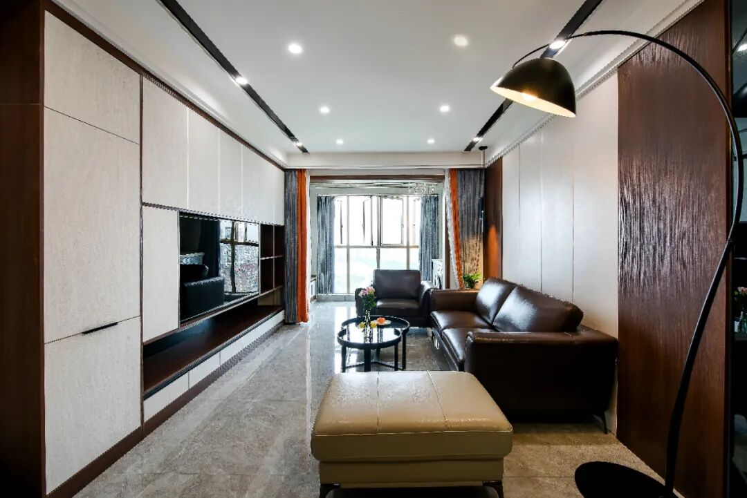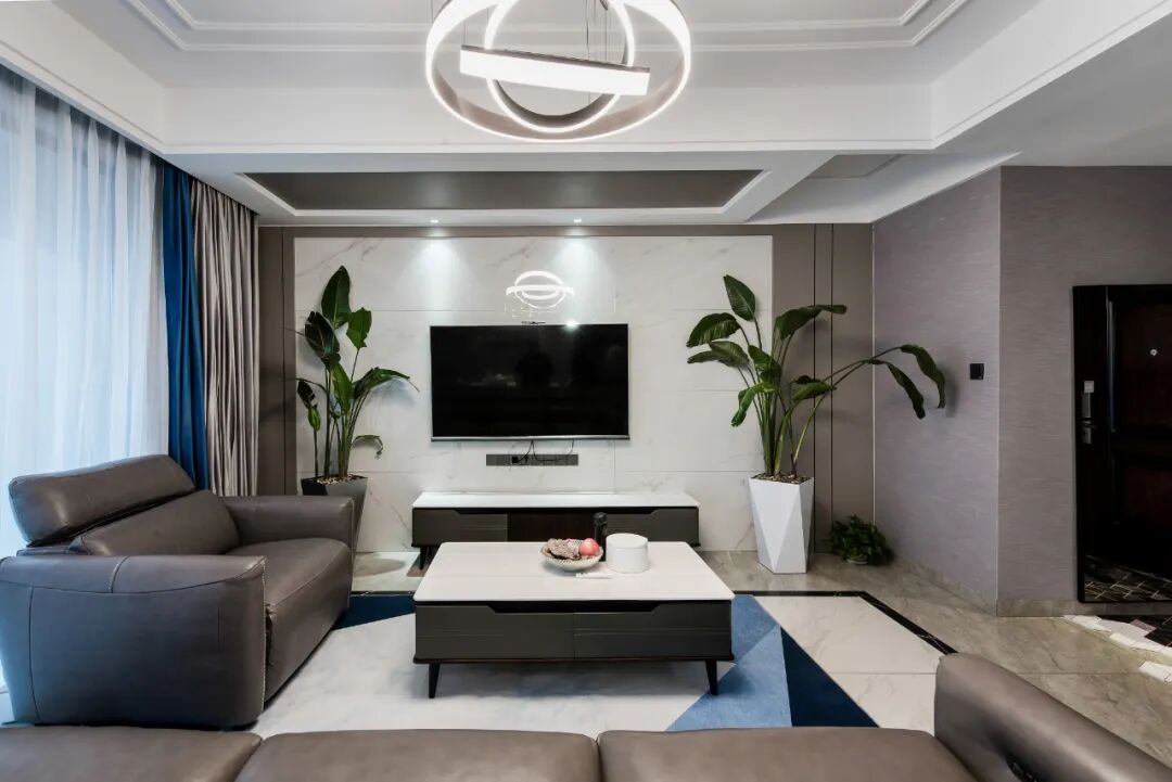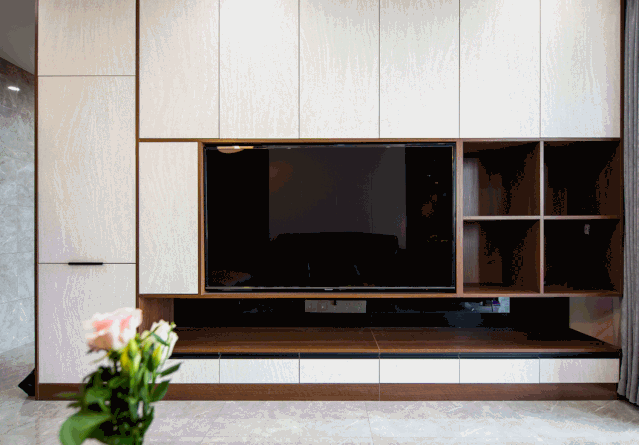 把電視背景墻與過道側(cè)面做成隱藏式儲物柜,無把手造型更能突出客廳的整體性,提高收納空間,顏值還很高。